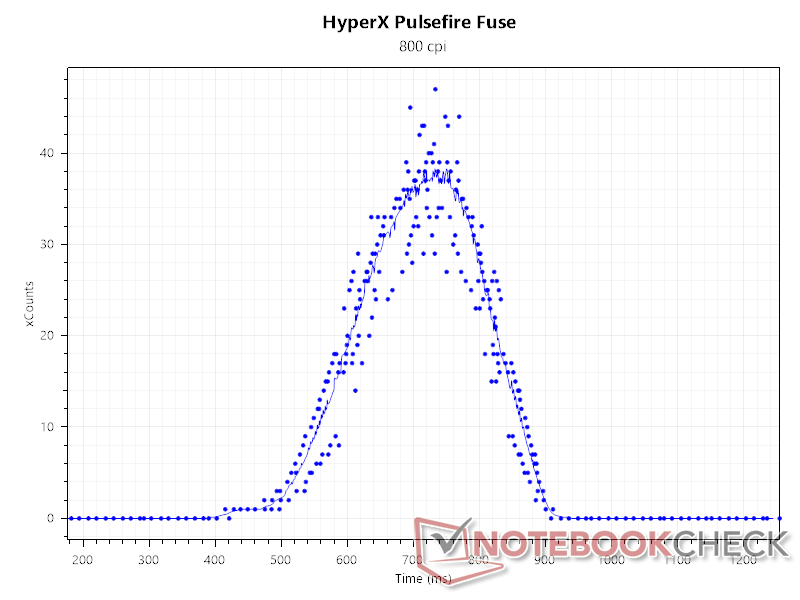 При частоте опроса 1 кГц и 800 DPI мы обнаружили, что PAW3311 от Fuse Wireless отслеживает большое количество отсчетов, близких к центральной кривой.