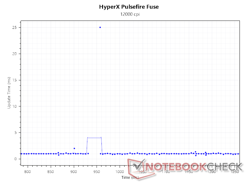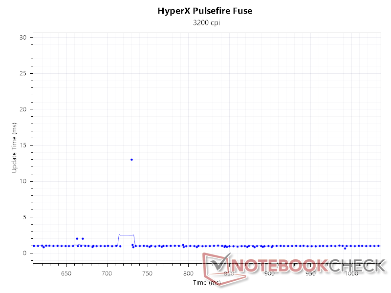 Мы обнаружили, что Pulsefire Fuse Wireless поддерживает довольно стабильную частоту опроса 1,000 Гц, хотя иногда она может превышать 1,100 Гц в течение примерно 10 мс.