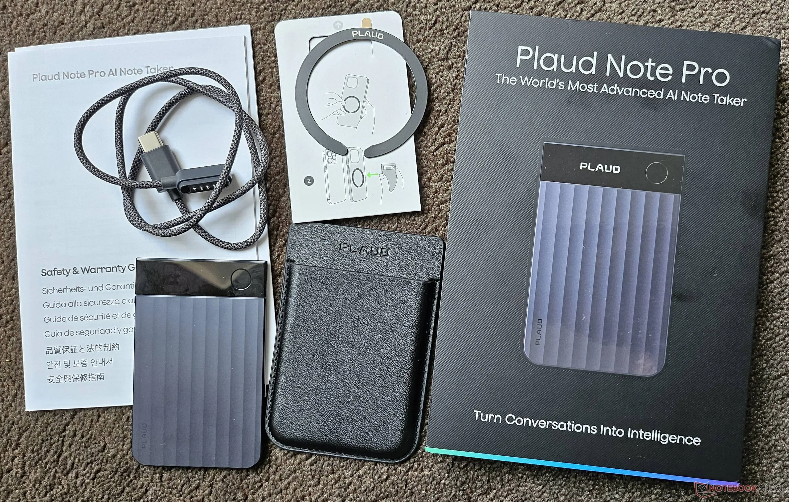 В компактную упаковку входит все необходимое: Plaud Note Pro, магнитный чехол из искусственной кожи, плотно облегающий устройство, магнитный кабель для зарядки USB-C для подключения к смартфону, краткое руководство по эксплуатации и самоклеящееся магнитное кольцо. При использовании чехла магнитный порт для зарядки, маленький экран и кнопка управления остаются доступными. Если Вы хотите быстро зарядить Plaud Note Pro через компьютер, чтобы сберечь аккумулятор смартфона, Вам придется найти адаптер, если на компьютере нет порта USB-C.
