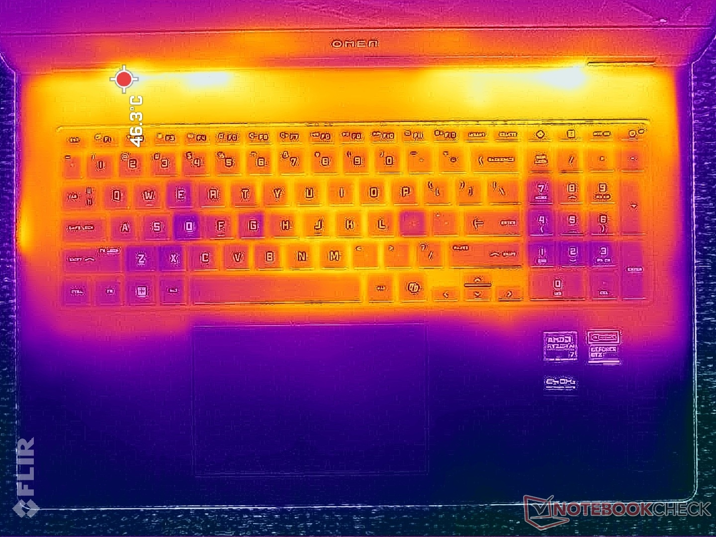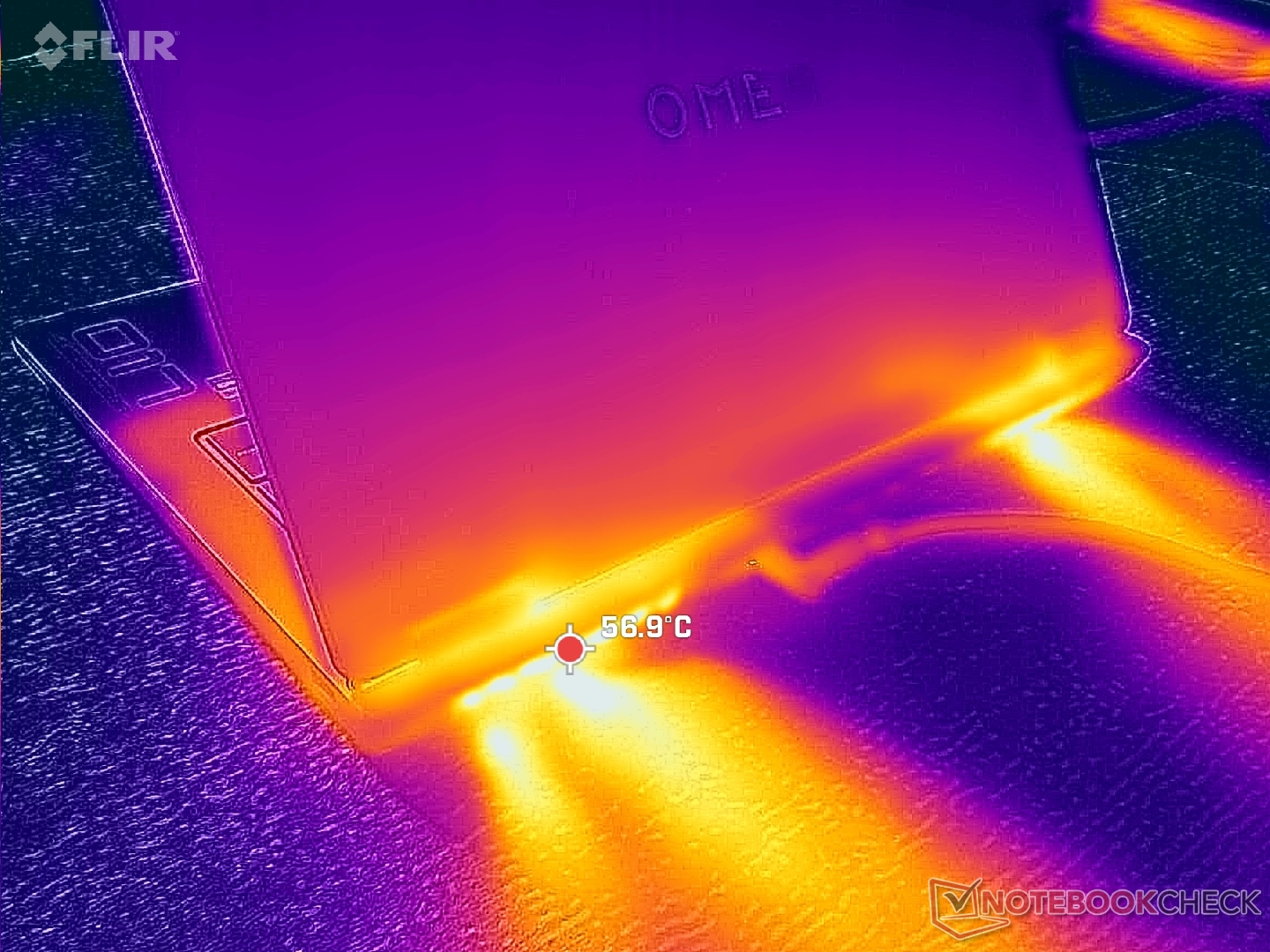 Средняя температура поверхности на несколько градусов C ниже, чем у конкурирующего ноутбука Lenovo LOQ 17IRX10 где температура в горячих точках может достигать более 45 C в аналогичных условиях.