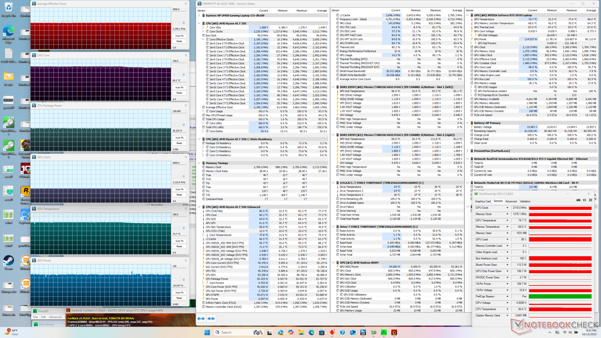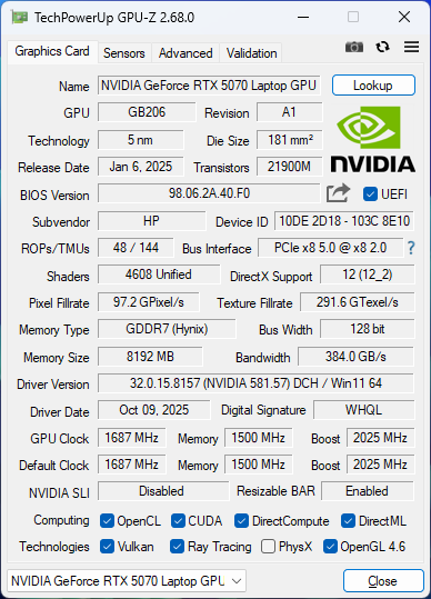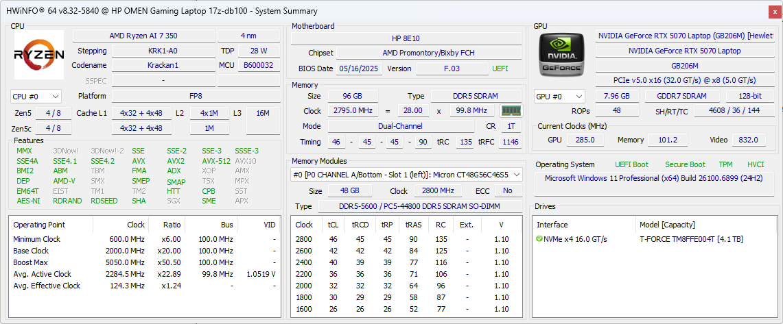 | HP Omen 17z-db100 AMD Ryzen AI 7 350 ⎘ NVIDIA GeForce RTX 5070 Laptop ⎘ 96 Гбайт ОЗУ, 4000 Гбайт SSD | Amazon: $1,813.29 Прейскурантная цена: 1550 USD | 2.9 килог. | 30.1 мм | 17.30" 2560x1440 170 PPI IPS | |