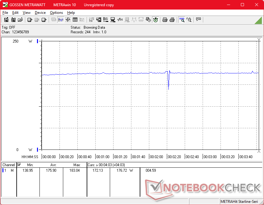 Мы зафиксировали максимальное потребление 228 Вт от среднего (~18 x 8,5 x 2,5 см) 230-ваттного адаптера переменного тока при 100-процентной загрузке CPU и GPU.