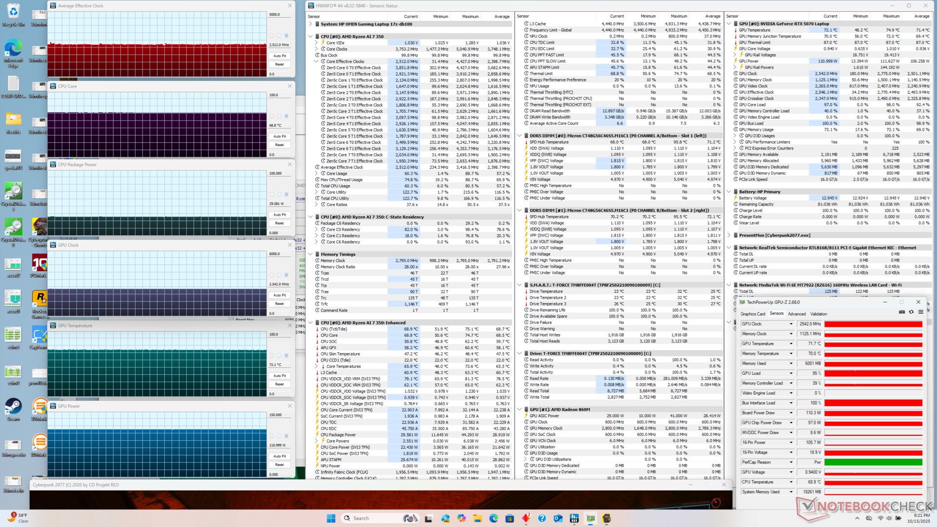 Средний уровень потребления под нагрузкой в целом ниже, чем у прошлогодней модели, даже несмотря на то, что наша новая модель обладает более высокой производительностью. Например, при запуске Cyberpunk 2077 наша модель 2025 Omen 17 потребляет на 12% меньше энергии, работая при этом на 17% быстрее, что повышает производительность на ватт. Преимущество в частоте кадров может быть еще больше, если использовать функцию генерации нескольких кадров, поскольку эта функция недоступна на графических процессорах серии GeForce RTX 40.