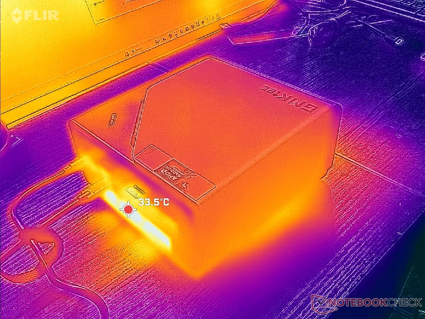 Система охлаждения состоит из двух вентиляторов и кулера с паровой камерой. Шум вентиляторов, тем не менее, громкий - 35 дБ(А) на фоне тишины в 24 дБ(А) даже при работе на холостом ходу на рабочем столе. При повышенной нагрузке уровень шума достигает 40 дБ(А), что является средним показателем для мини-ПК.