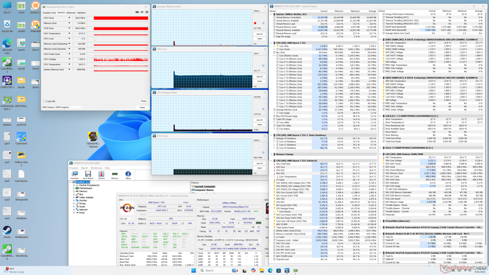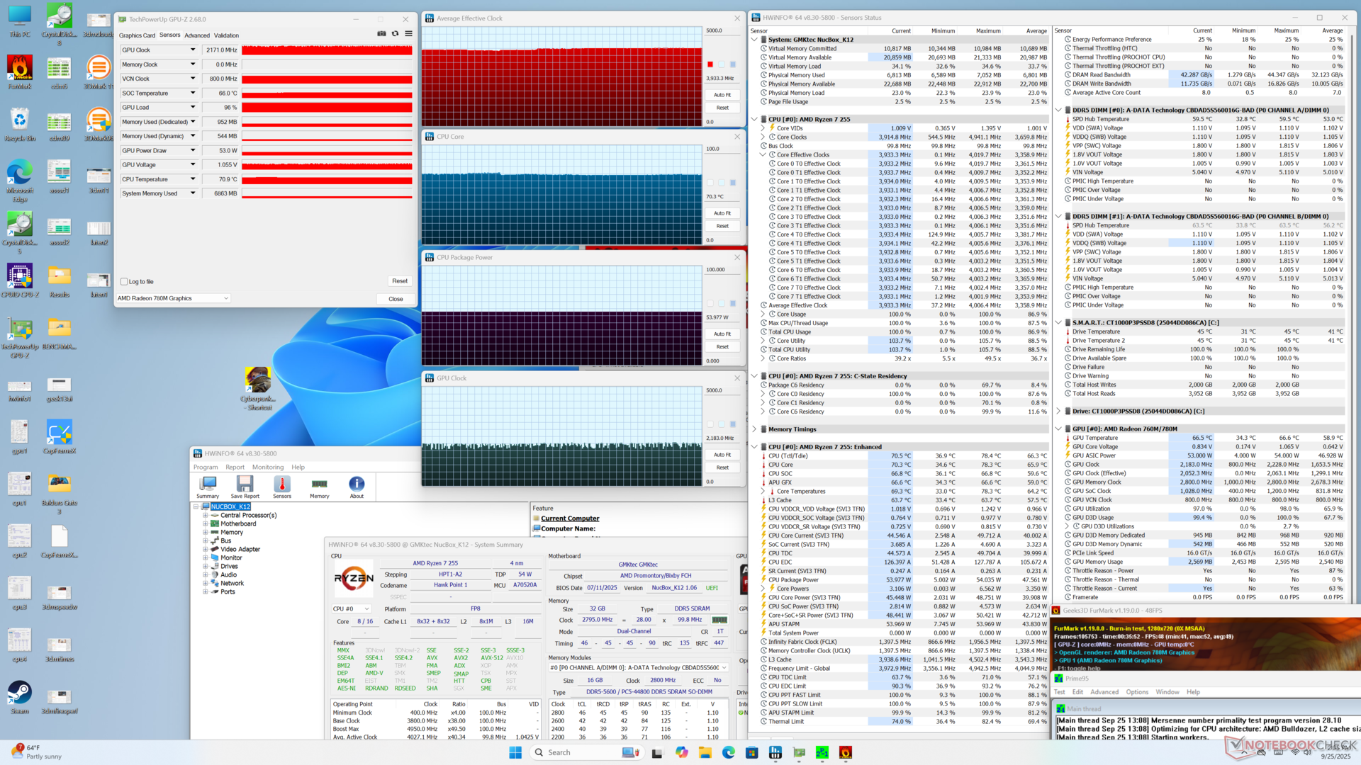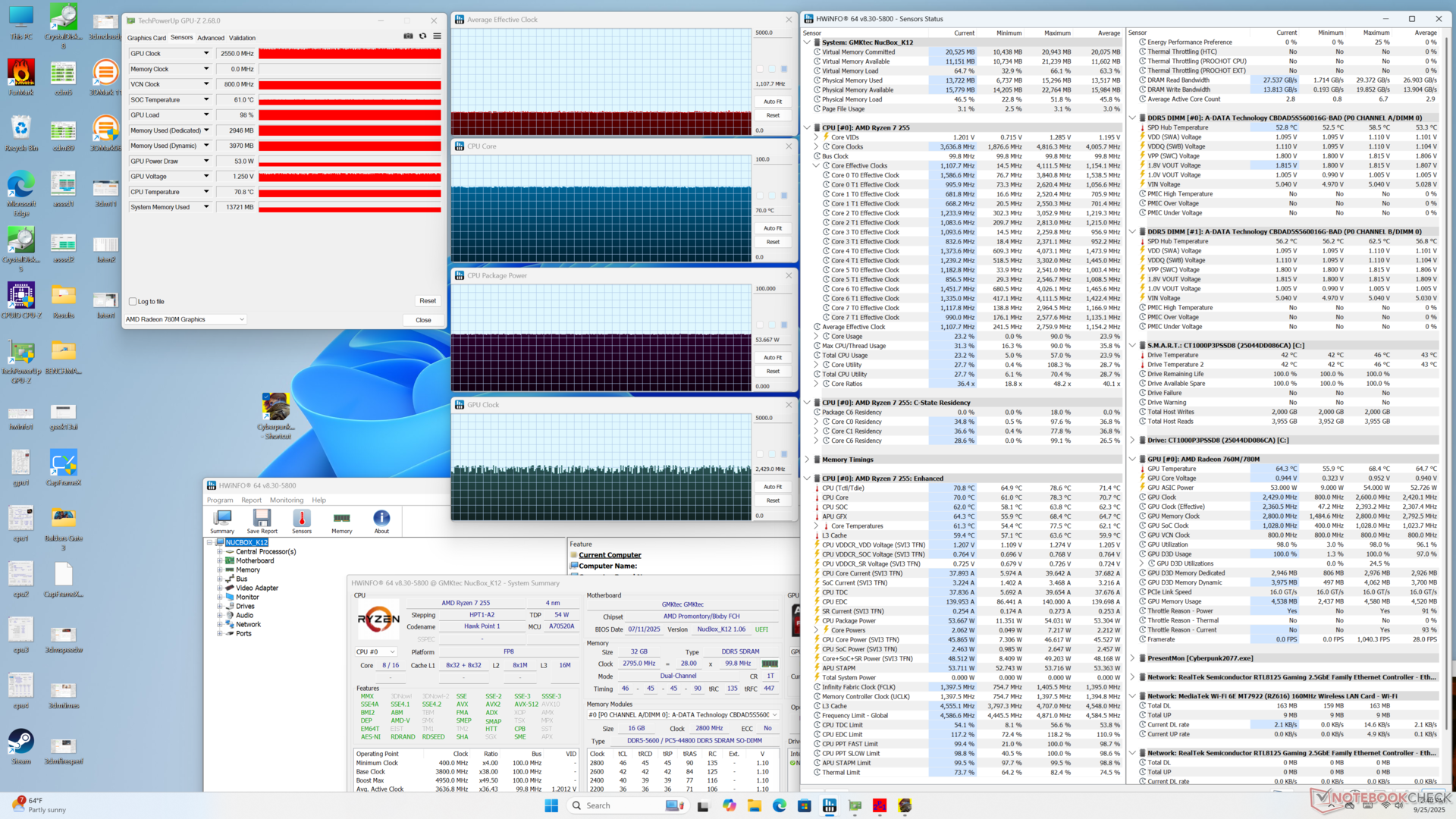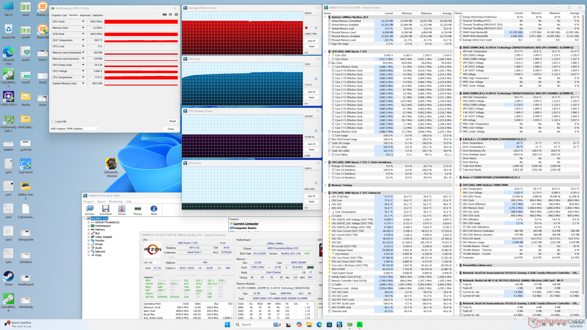 При запуске стресса Prime95 частота процессора стабилизировалась на уровне 3,9 ГГц, 54 Вт и 78 C. При запуске Cyberpunk 2077, представляющего типичную игровую нагрузку, встроенный GPU стабилизировался на частоте 2550 МГц и температуре 70 C, что близко к тому, что мы зафиксировали на меньшей модели NucBox K11.