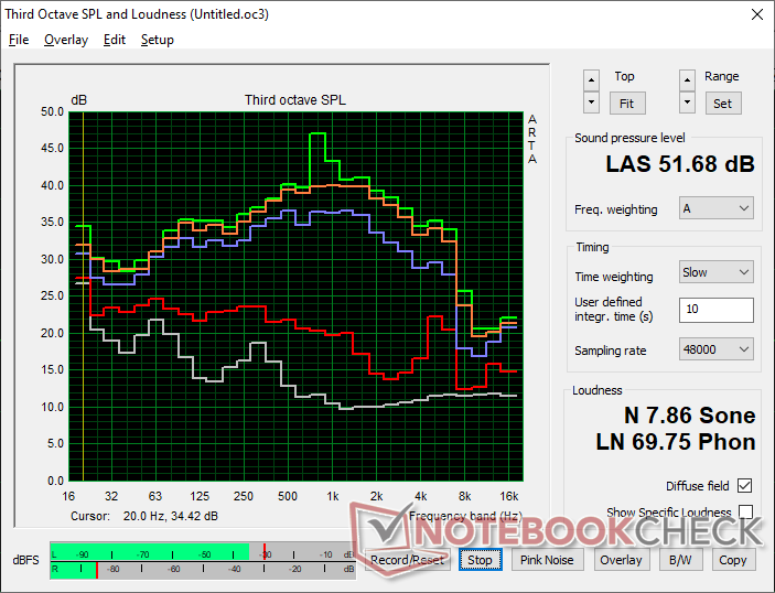 Вентиляторы всегда активны, независимо от нагрузки на экран. Хотя они не очень громкие, постоянное жужжание слышно даже при низких нагрузках, таких как просмотр веб-страниц или потоковое видео. При более высоких нагрузках, например, в играх, шум вентиляторов может достигать 50 дБ(А) и быть громче, чем у большинства ультратонких ноутбуков.