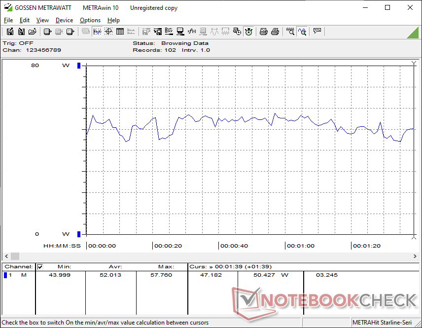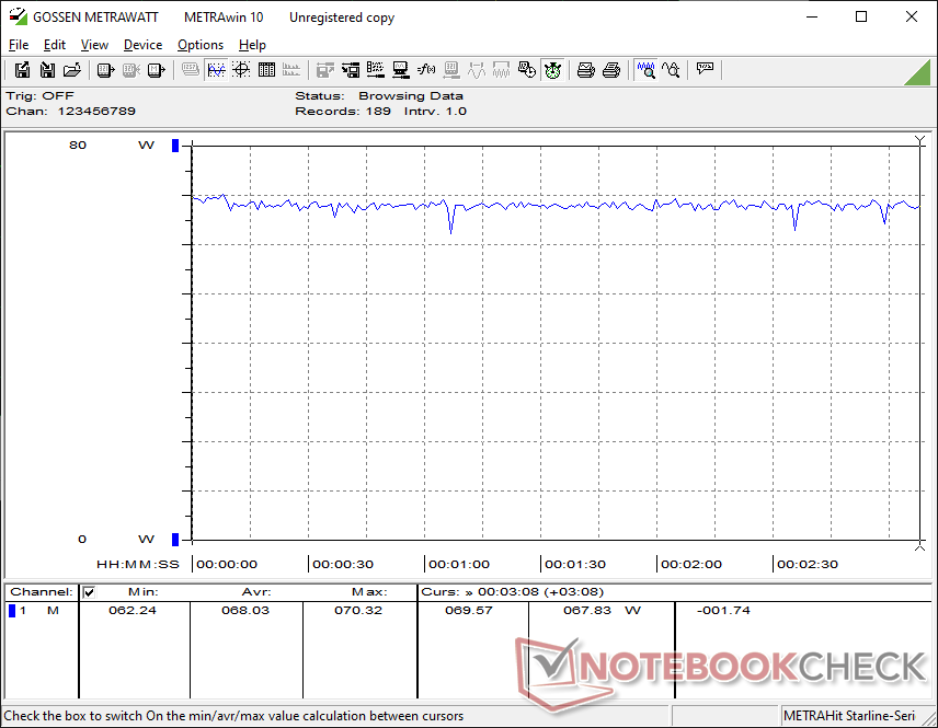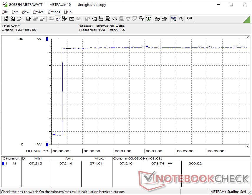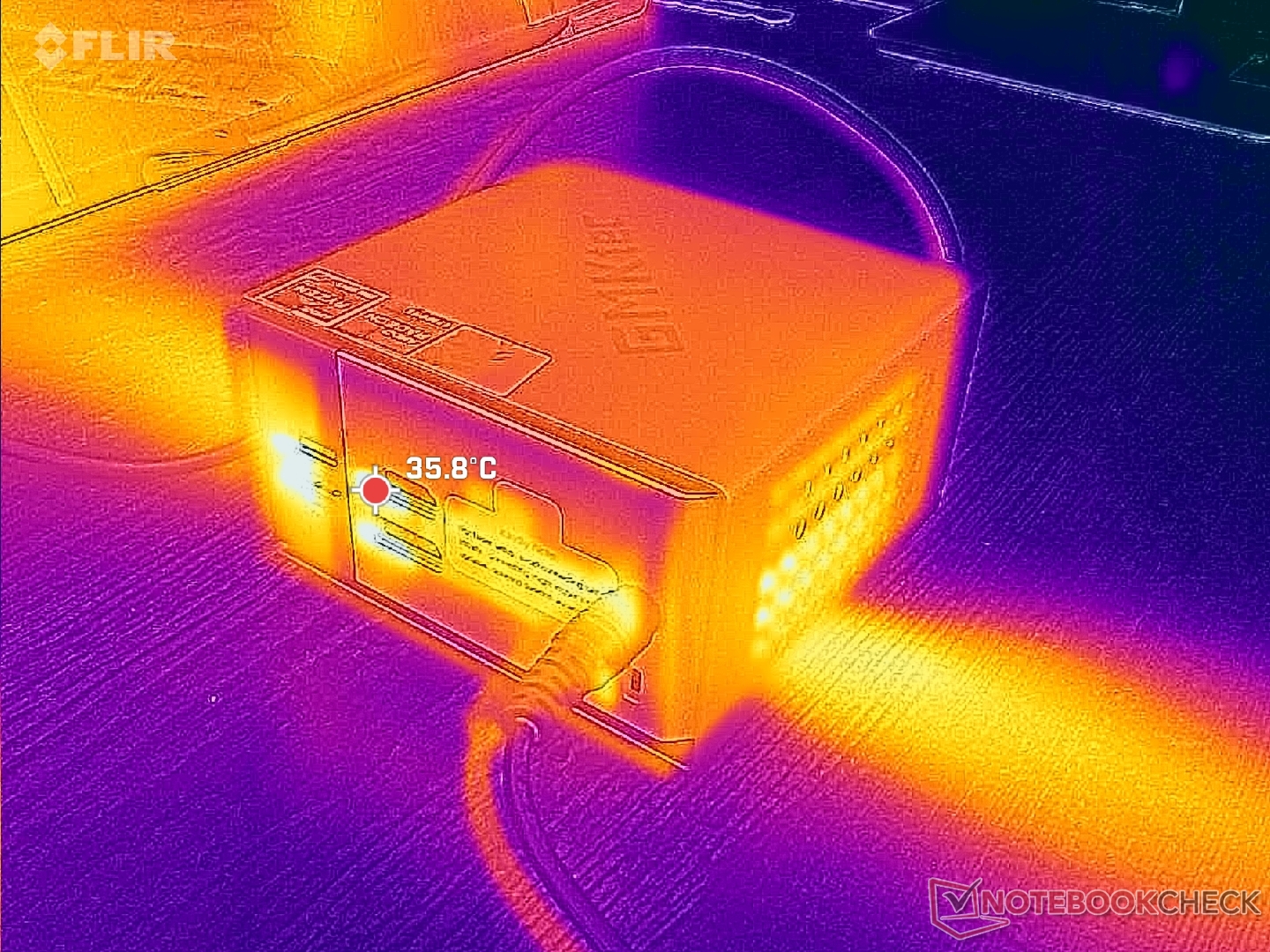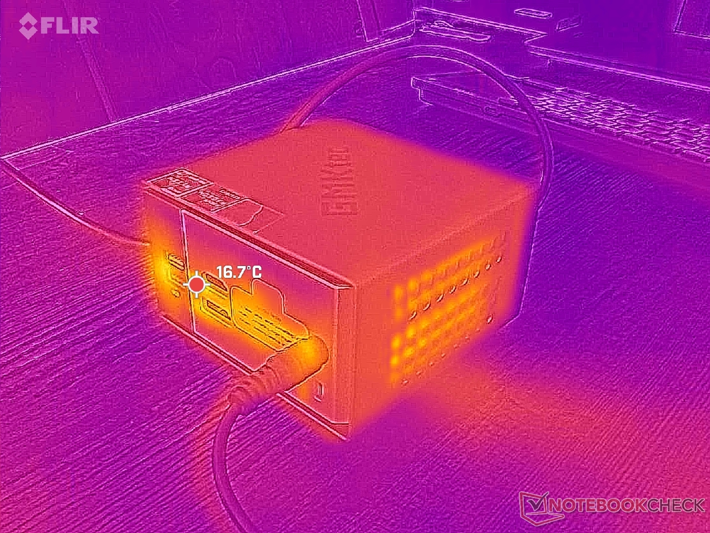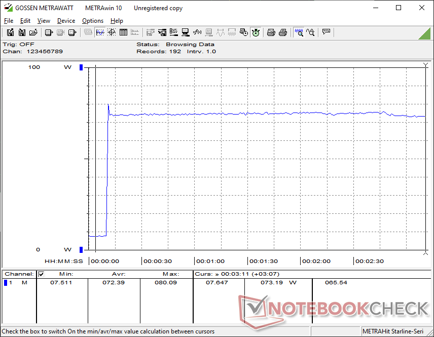 Мы смогли измерить максимальное потребление 80 Вт от среднего (~13,3 x 5,8 x 3,2 см) 120-ваттного адаптера переменного тока.
