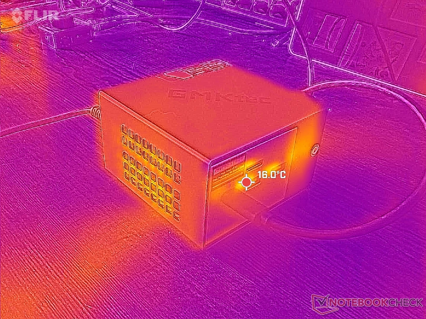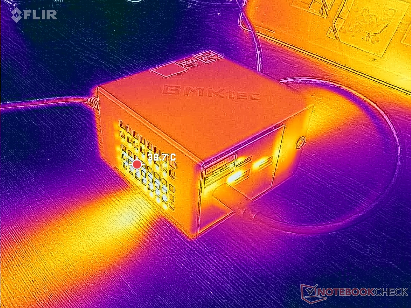 Свежий воздух поступает через щели вдоль верхнего края устройства, а затем выходит с двух сторон. В отличие от этого, в большинстве других моделей мини-ПК отработанное тепло выходит через заднюю часть. Если расположить NucBox K16 на боку, это закроет вытяжные решетки и потенциально повлияет на температуру и производительность.