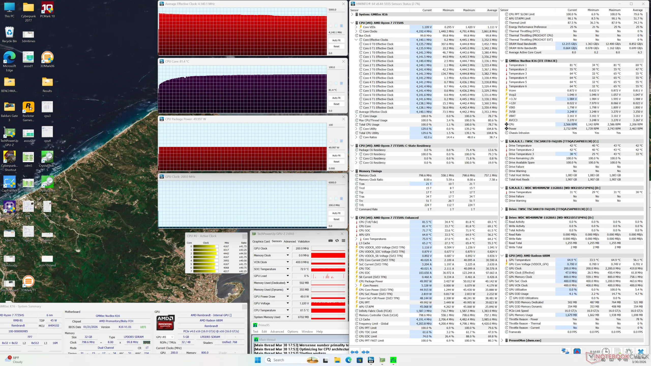 Частота процессора стабилизировалась на уровне 4,1 ГГц, 50 Вт и 81 C при работе в режиме стресса Prime95, что на самом деле теплее, чем то, что мы зафиксировали на EVO-X1 с более новым и быстрым процессором Zen 5. Температура ядра продолжала оставаться выше на несколько градусов C и при запуске игр. Сайт NucBox K13 с более производительным Core Ultra 7 256V обеспечивает более высокую производительность в играх и более низкую рабочую температуру.