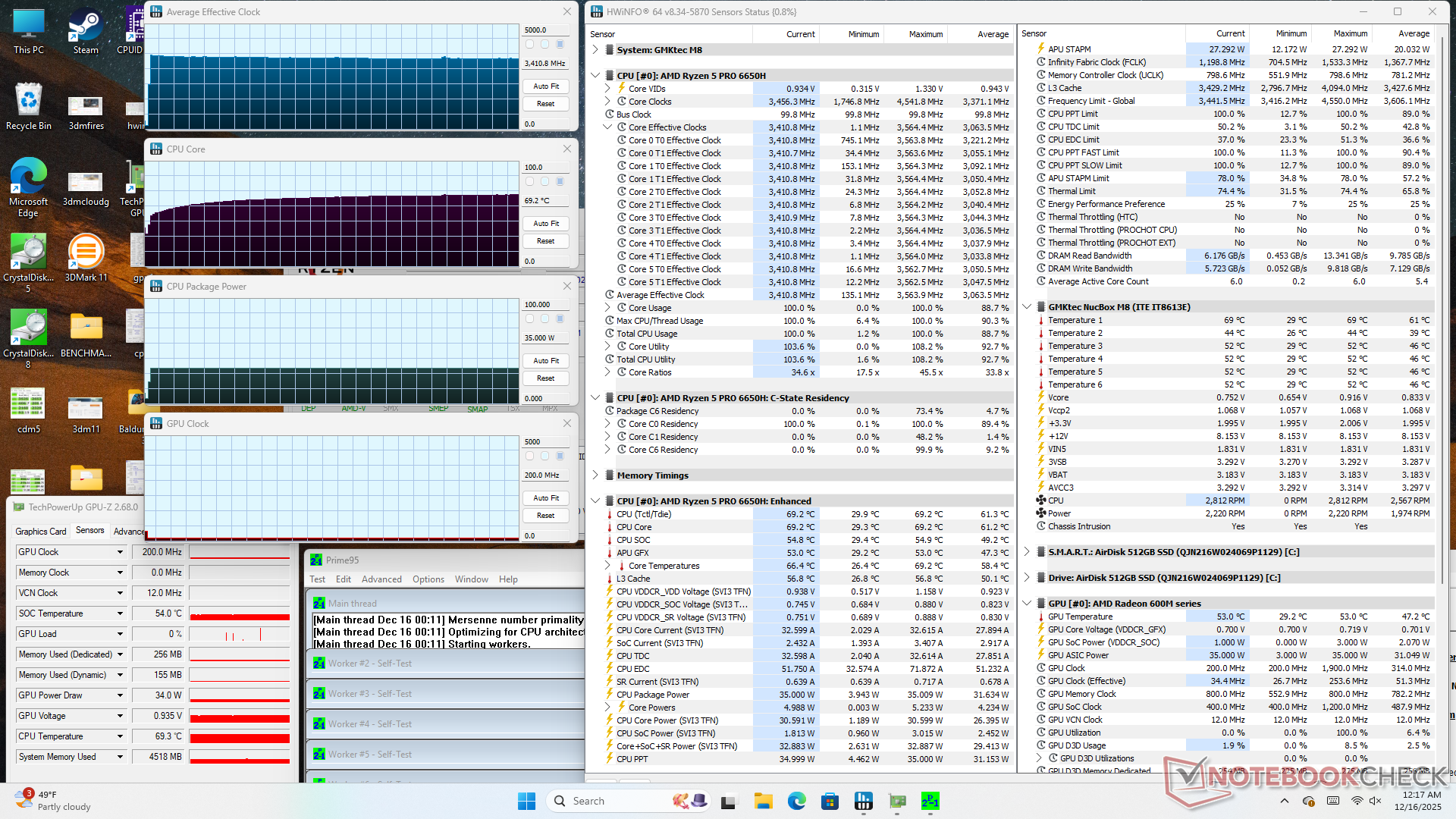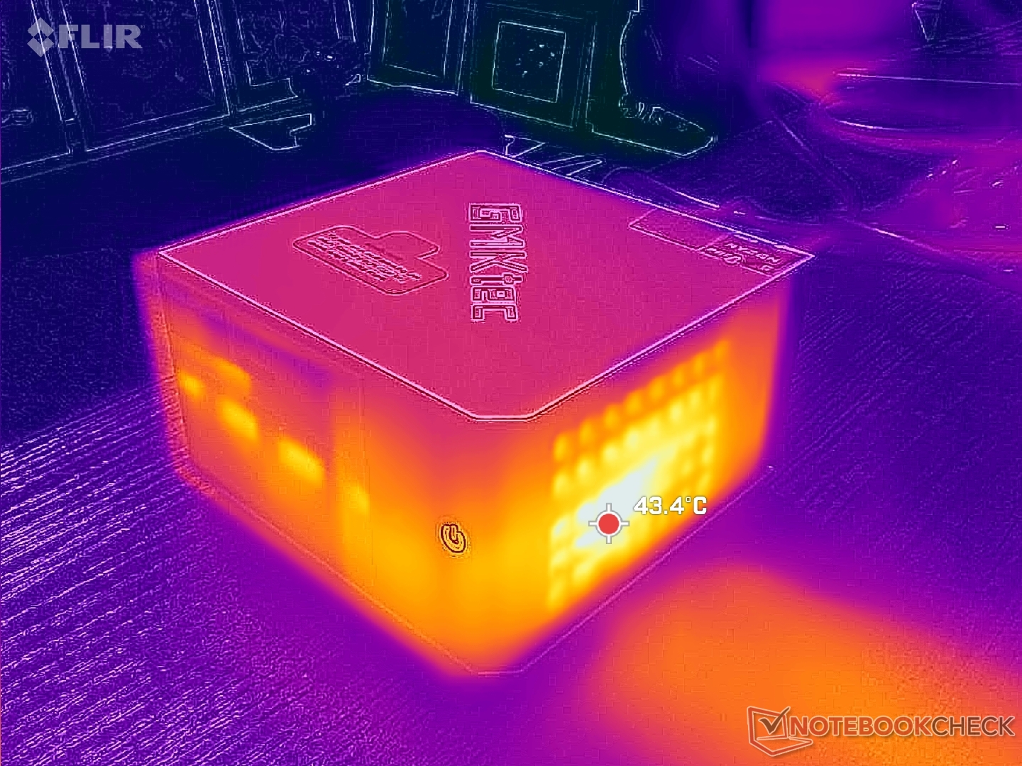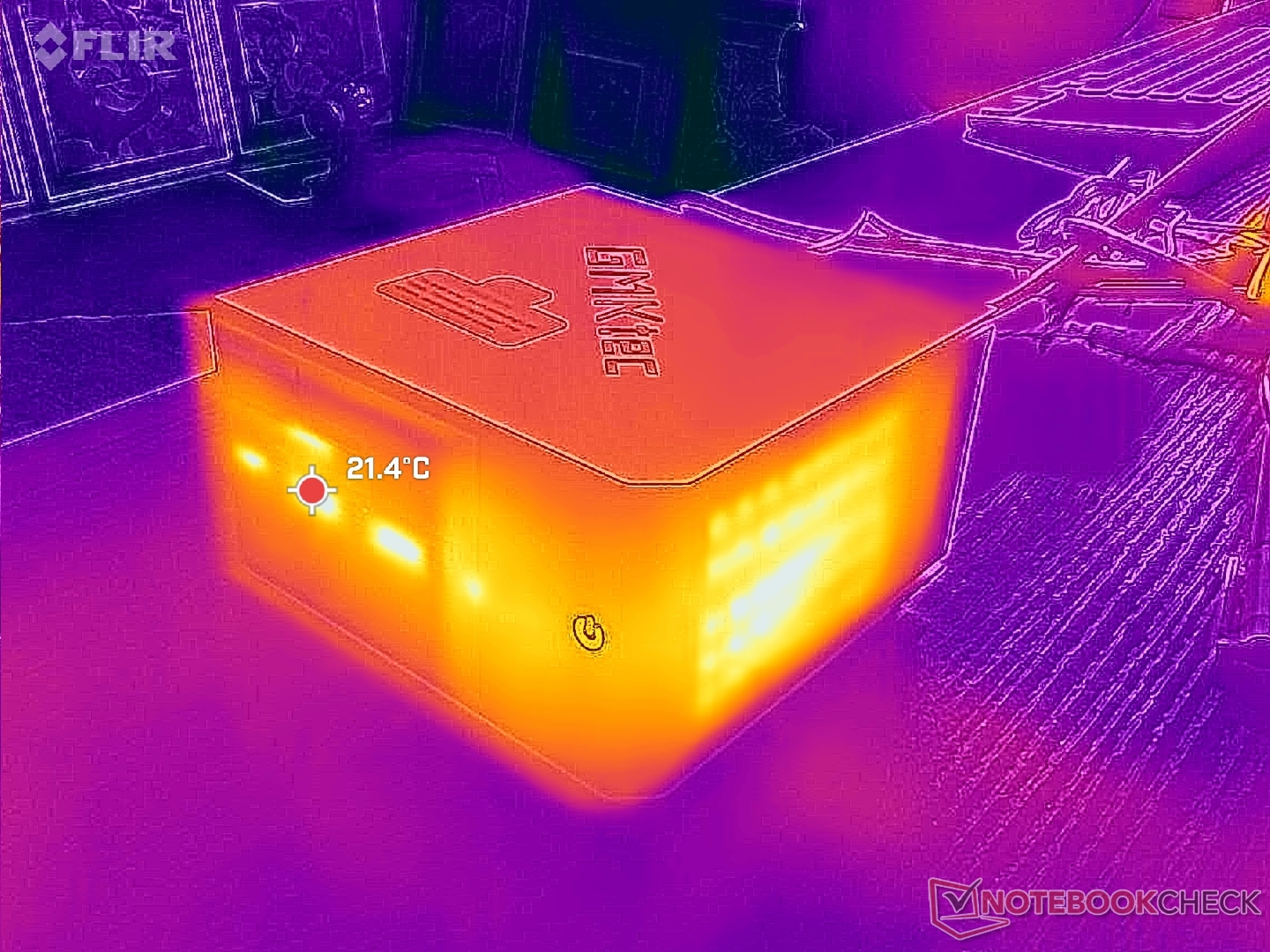 Частота процессора стабилизируется на уровне 3,4 ГГц, 35 Вт и 69 C при выполнении стресс-программы Prime95 или 1900 МГц и 67 C при выполнении требовательных нагрузок, например, игр. Температура немного выше, чем у MSI Cubi NUC AI+ 2MG, в котором используется более быстрый и новый процессор Intel Lunar Lake-V.