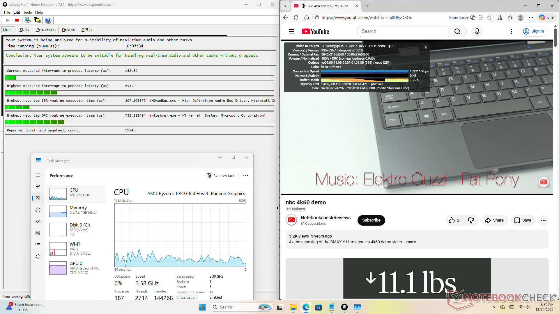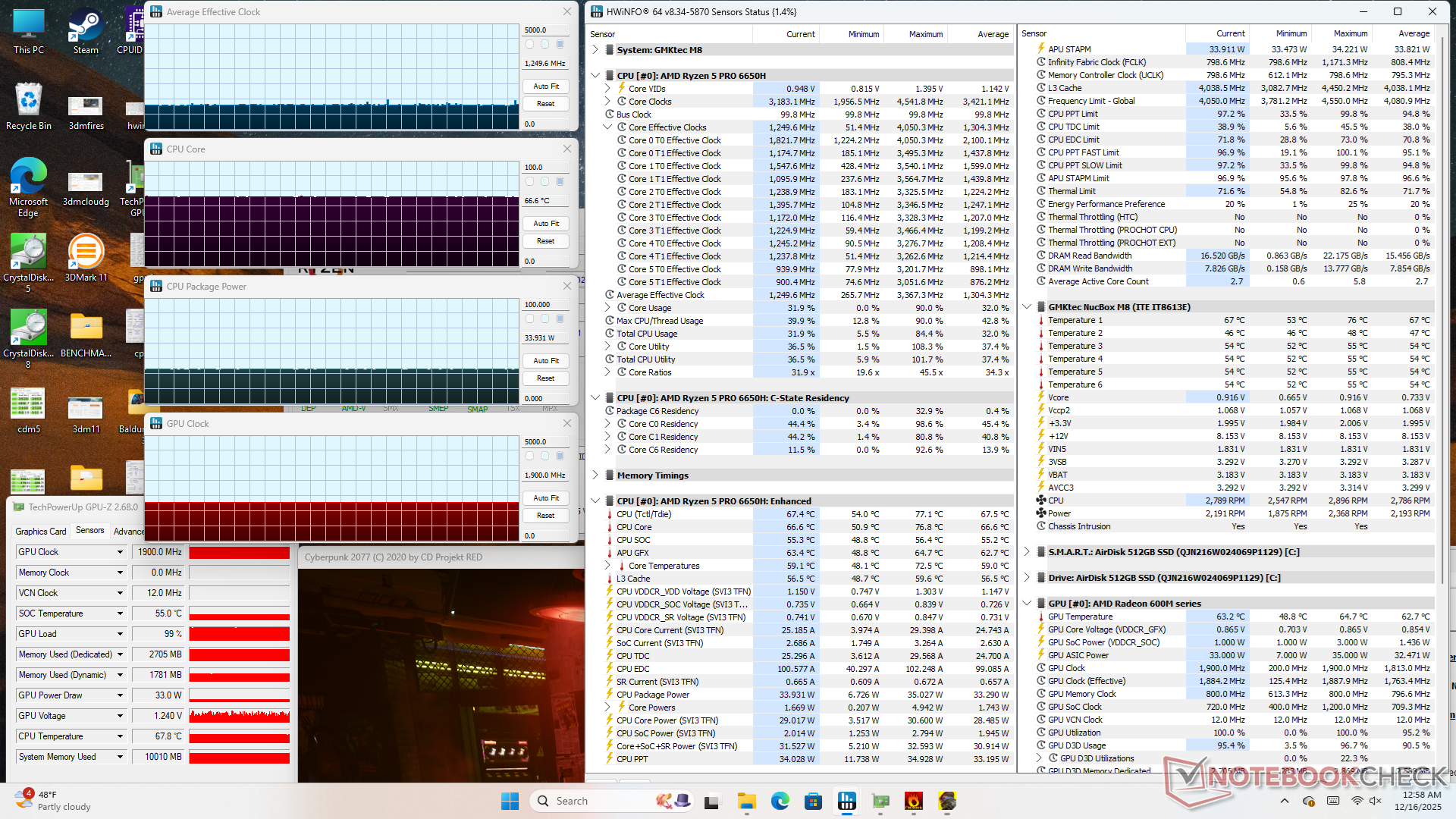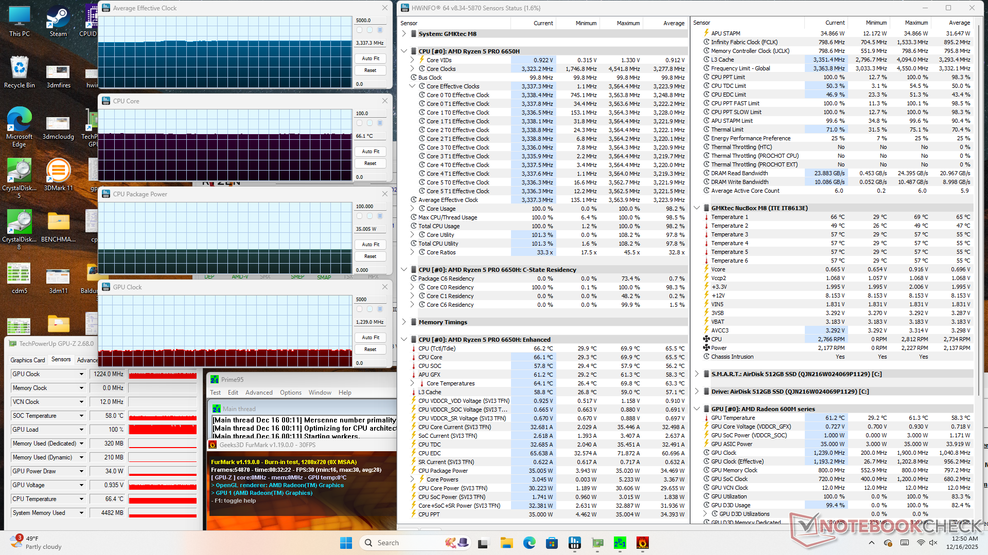 Частота процессора стабилизируется на уровне 3,4 ГГц, 35 Вт и 69 C при выполнении стресс-программы Prime95 или 1900 МГц и 67 C при выполнении требовательных нагрузок, например, игр. Температура немного выше, чем у MSI Cubi NUC AI+ 2MG, в котором используется более быстрый и новый процессор Intel Lunar Lake-V.