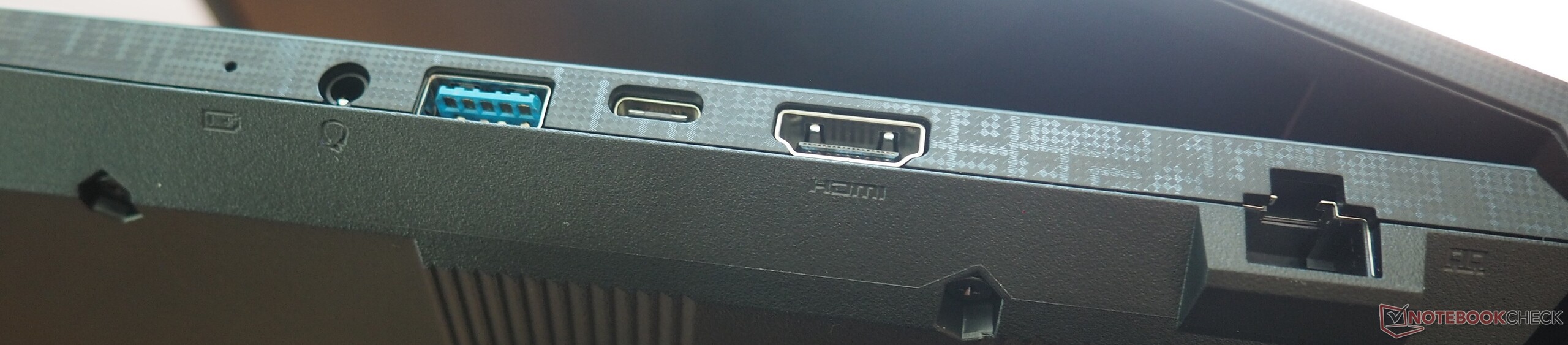 Katana 17 предлагает три порта USB-A (3.0) и один порт USB-C (3.1 Gen 2, включая DisplayPort), а также аудиоразъем, порт Gigabit Ethernet и выход HDMI 2.1. Скорость встроенного модуля Wi-Fi (Intel Wi-Fi 6E AX211) от приличной до очень хорошей, в зависимости от теста. Однако веб-камера HD имеет очень размытое изображение.