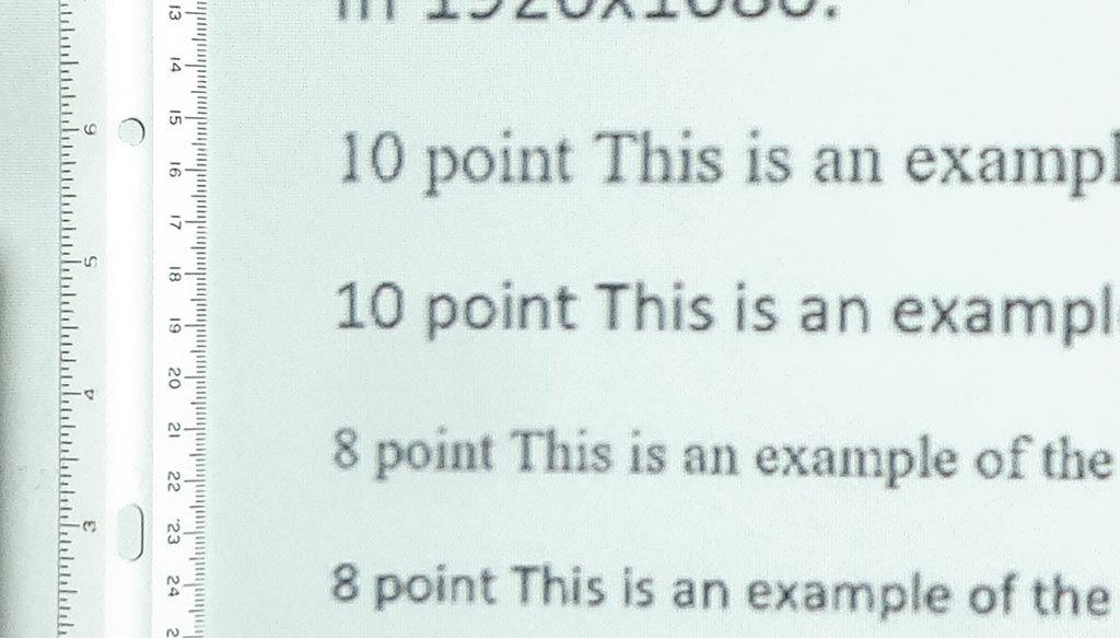 При подключении к компьютеру текст размером четыре пункта и больше хорошо читается, поэтому TCL C1 можно использовать в качестве внешнего дисплея для ПК. Пиксели становятся заметными при приближении к проецируемому изображению на расстояние 1 м (3,3 фута) или ближе, но обычно они не заметны при обычном расстоянии просмотра. Пикселизация становится навязчивой при использовании мелкого текста размером менее шести пунктов. Серые полосы не являются идеально гладкими, но видимая цветовая полоса обычно ограничивается темными тенями и плоскими участками цвета.