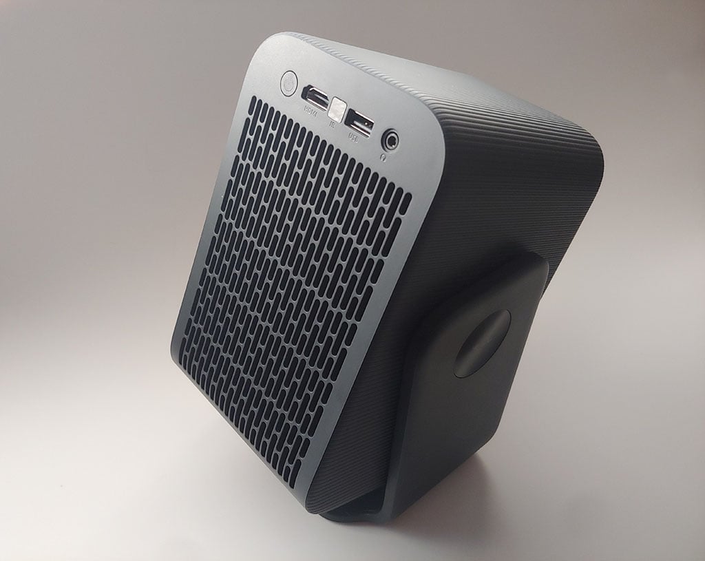 TCL C1 по размерам напоминает небольшой тостер с двумя ломтиками и весит примерно столько же, сколько кварта молока. Его полностью серый пластиковый корпус имеет закругленные края с тонким модифицированным рисунком в виде елочки, украшающим верхнюю и боковые стороны. Владельцам будет легко найти место для этого проектора на небольших столах благодаря его габаритам, примерно равным размеру футляра для компакт-диска.