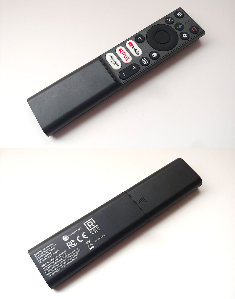 Входящий в комплект пульт дистанционного управления выполнен из пластика и имеет двухуровневый дизайн, в котором кнопки громкости расположены на более высоком уровне, чем основные кнопки. Все кнопки имеют короткий ход и четкий отклик, хорошо читаемы на расстоянии вытянутой руки. Кнопки не имеют подсветки и не светятся в темноте. Задняя часть пульта слегка текстурирована для лучшего захвата, что помогает при снятии крышки для замены двух батареек ААА. ИК-приемник расположен рядом с задними портами, хотя пульт достаточно мощный, чтобы не направлять его прямо на TCL C1 для управления им.
