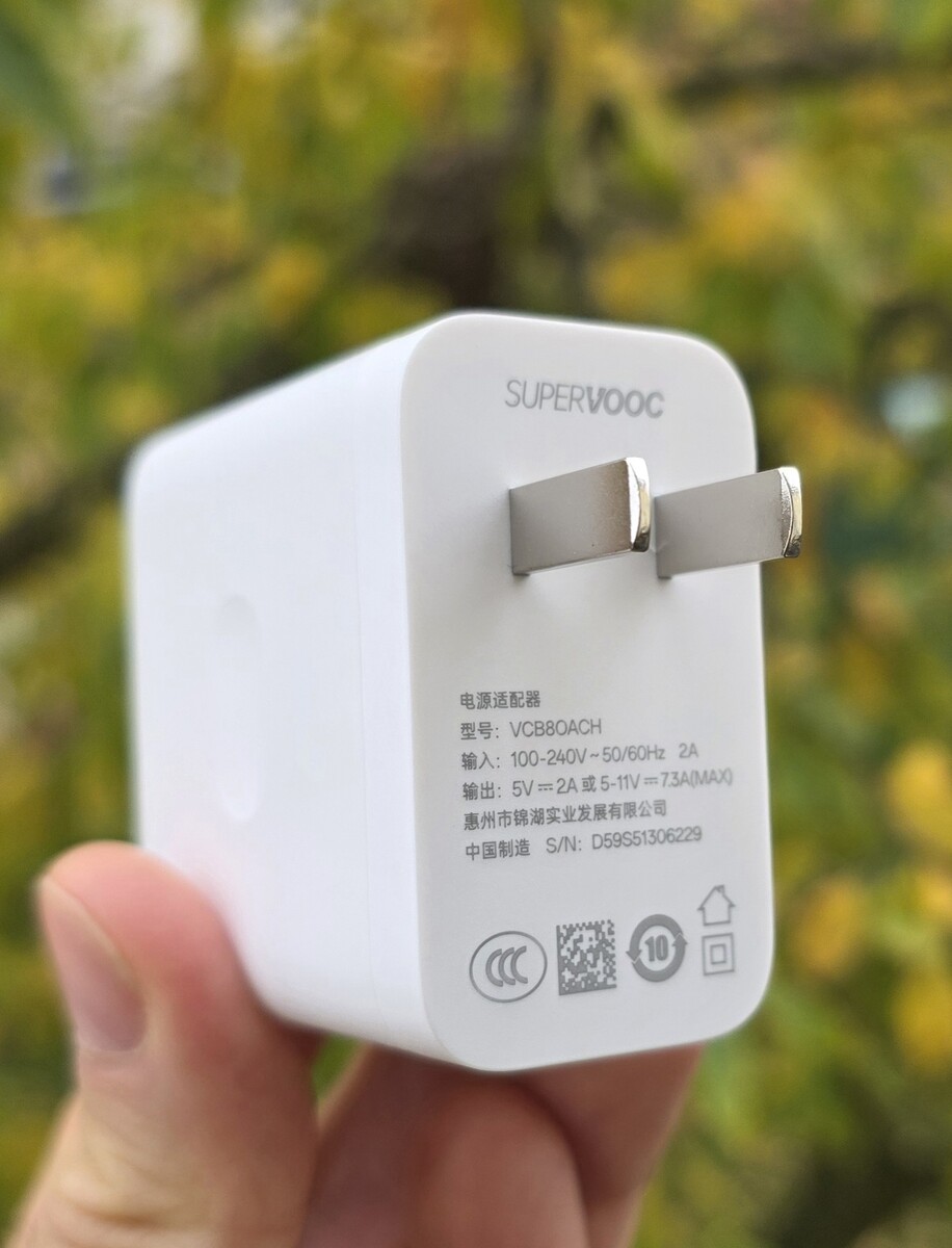 Входящее в комплект зарядное устройство SuperVOOC заряжает флагманский смартфон с пиковой мощностью 80 Вт (11 В, 7,3 А) и весит всего около 106 грамм. Oppo немного слишком "традиционна", когда речь заходит о порте USB, поскольку использует только разъемы Type-A, поэтому логично, что входящий в комплект USB-кабель также имеет только разъем Type-A, а не более современный разъем USB-C - USB-C. Поскольку все меньше и меньше ноутбуков используют этот старый стандарт, Oppo давно пора обновить свои адаптеры питания.