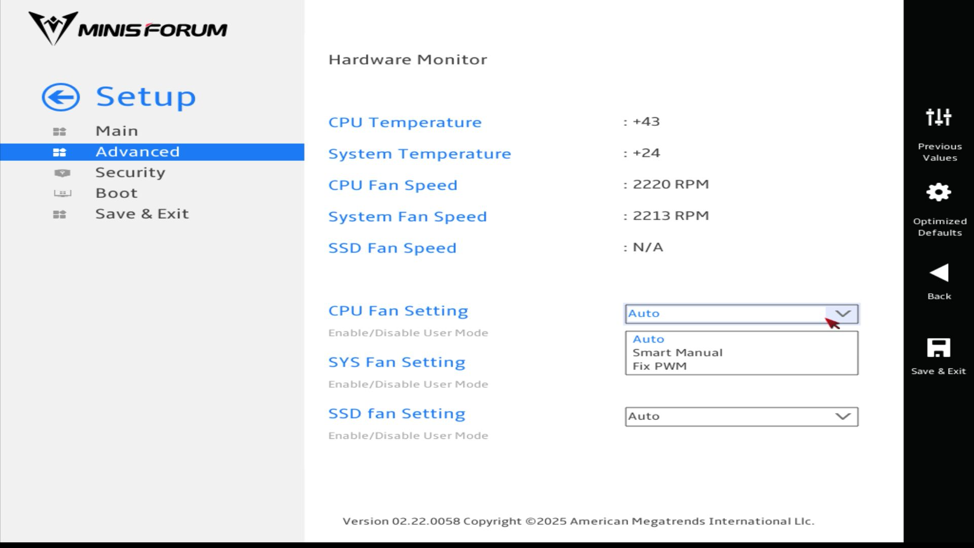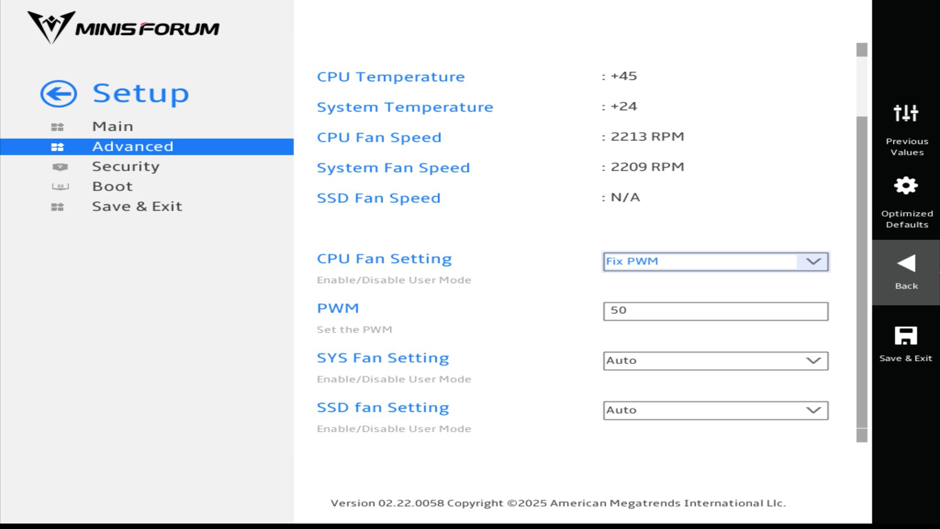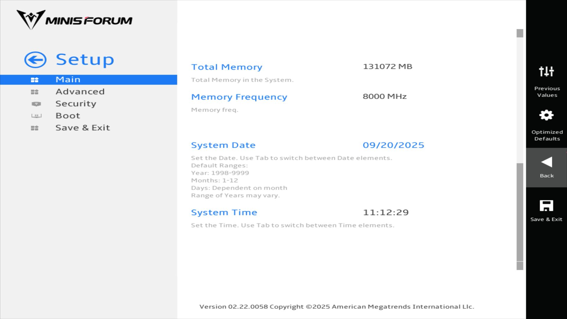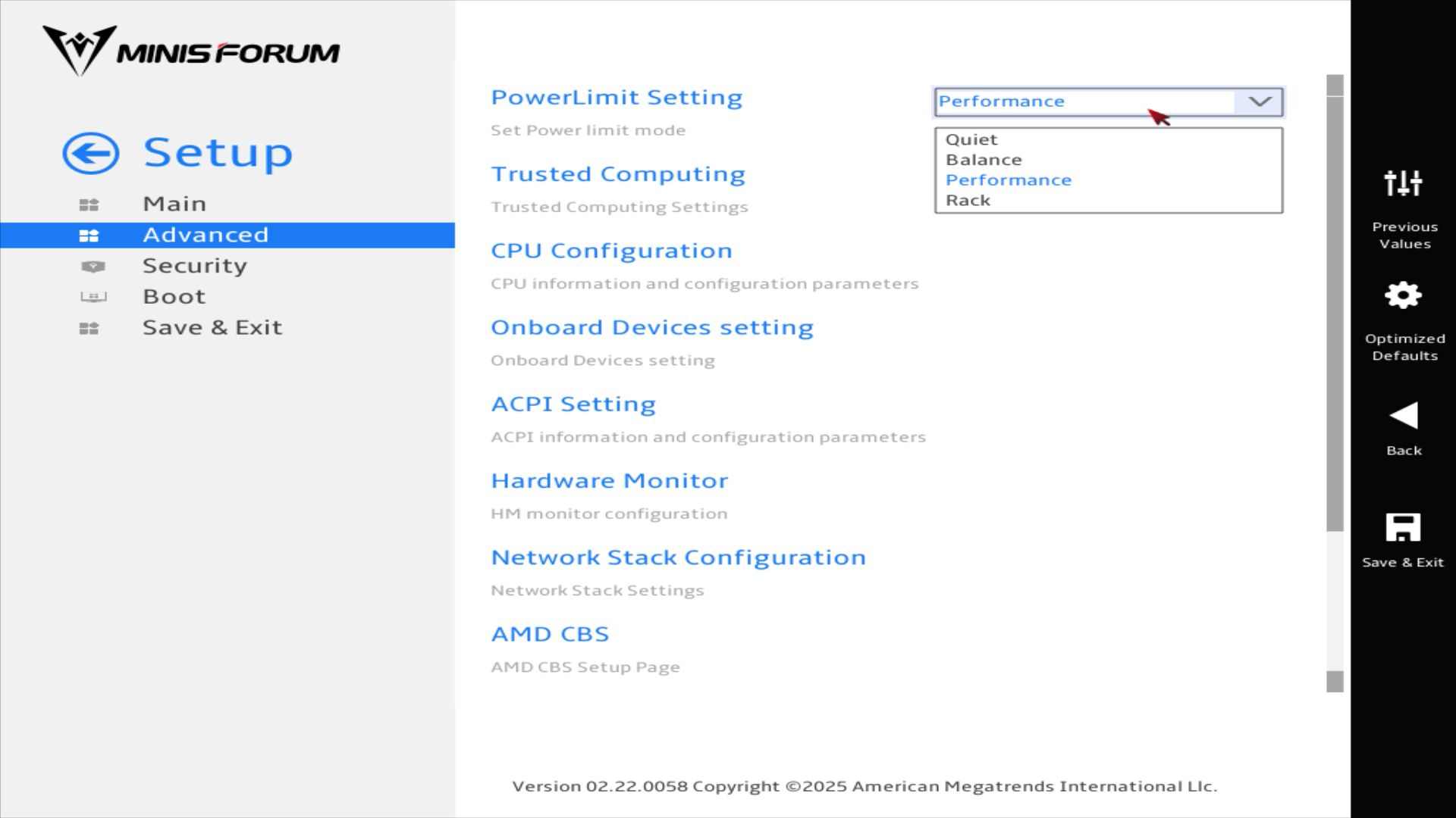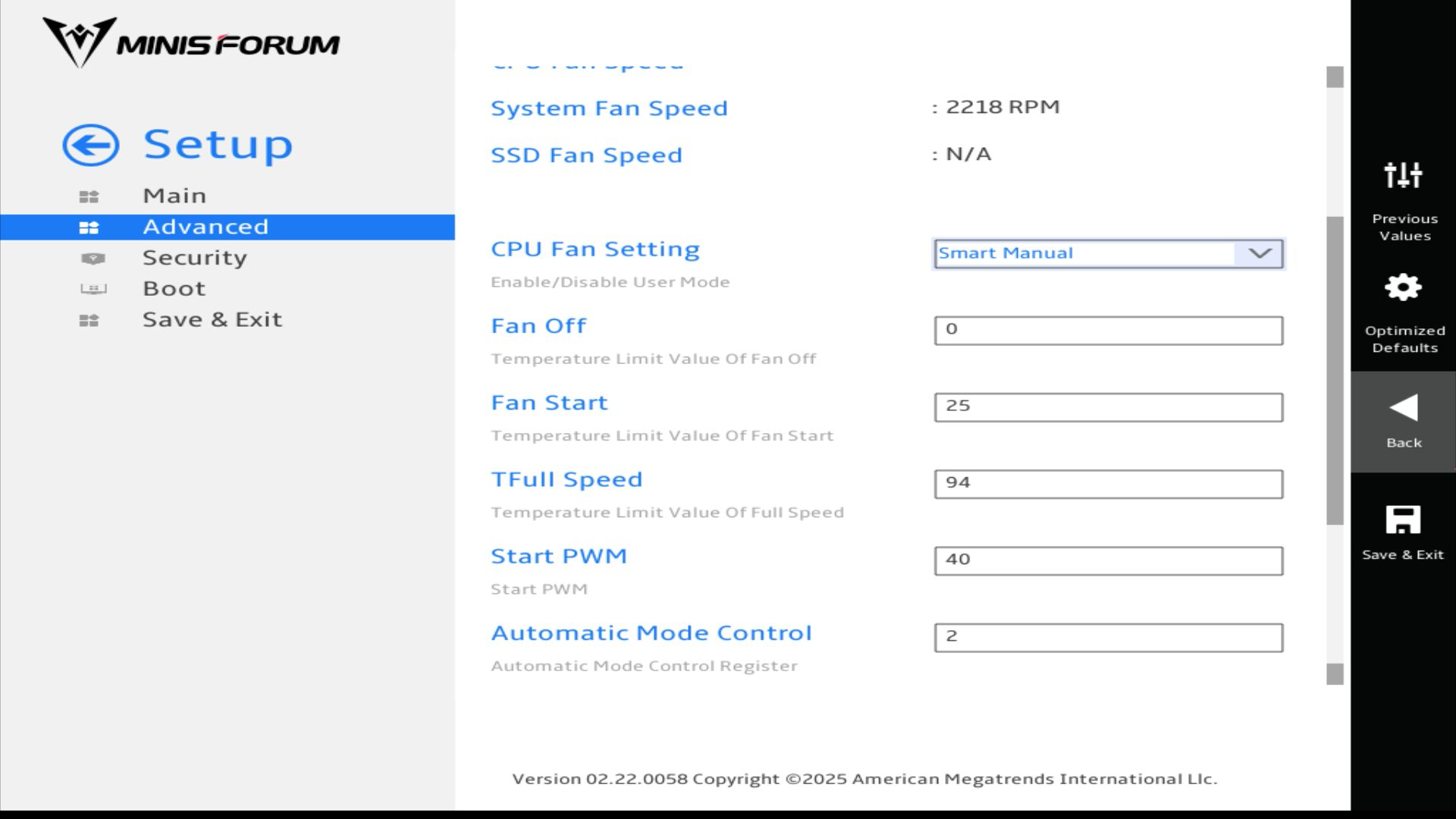 По нашим измерениям, Minisforum MS-S1 Max хорошо слышно при полной нагрузке, но проблематично громко на холостом ходу (46 дБ(А)), что приводит к значительному снижению общей оценки. Тем не менее, тепловую проблему можно исключить. Мы проинформировали Minisforum перед публикацией теста. В итоге система работает так, как должна. UEFI предлагает больше возможностей, чем Bosgame M5 или GMKtec EVO-X2 для ручной настройки. При установленной вручную скорости вращения вентилятора в 50% уровень звукового давления снижается до 38,5 дБ(А).