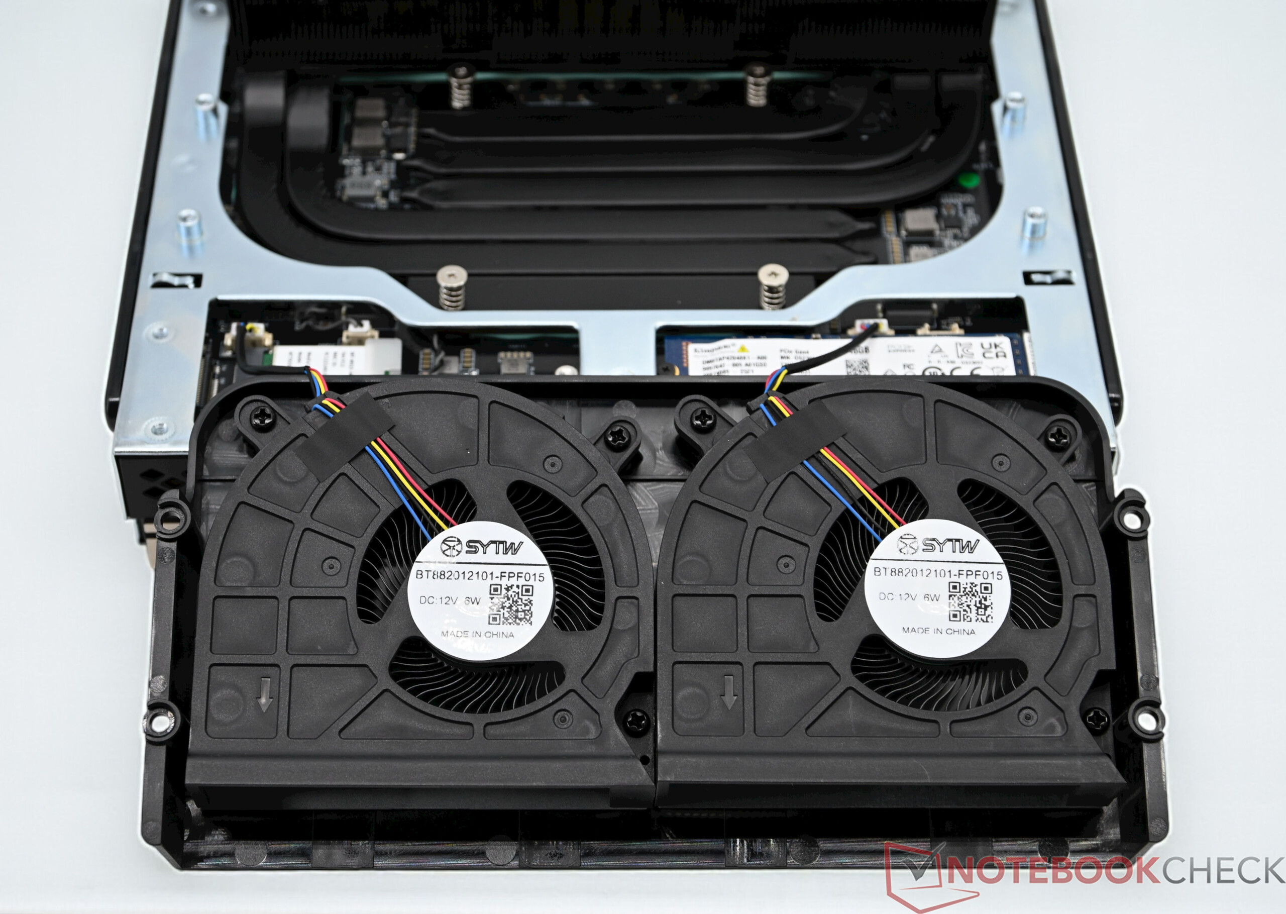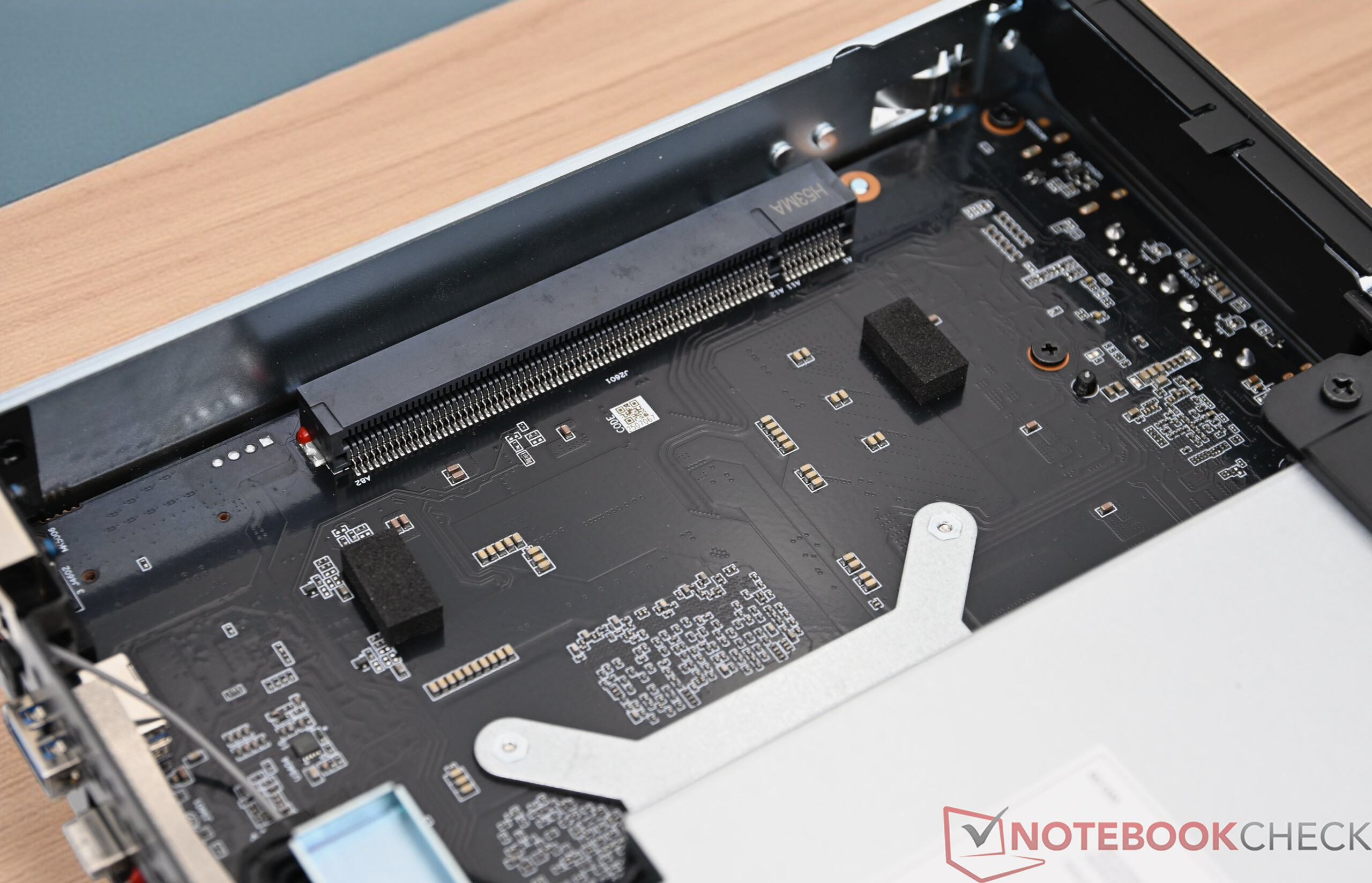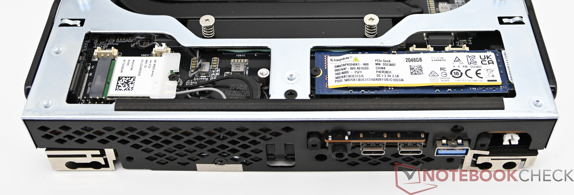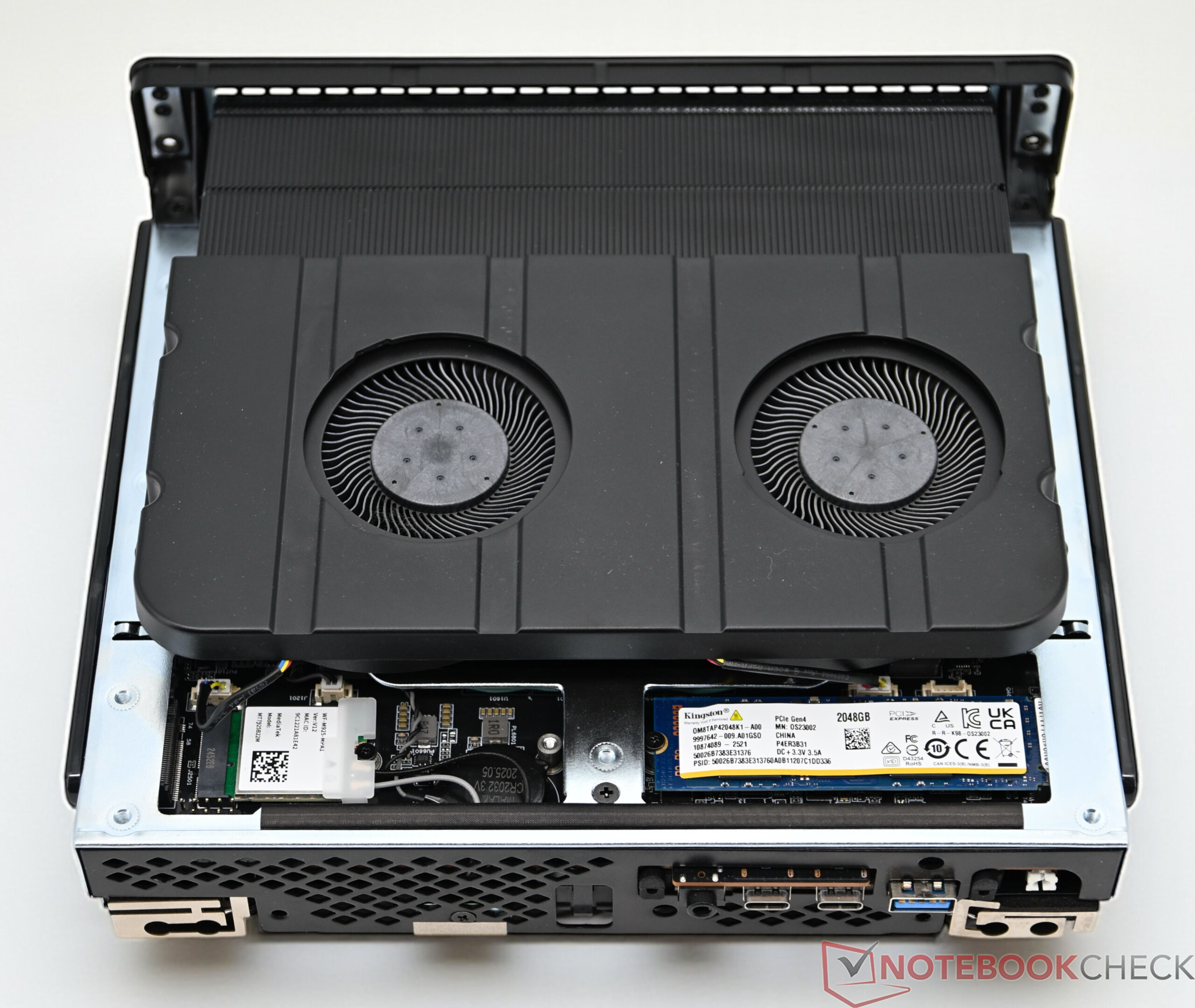 Minisforum MS-S1 Max очень легко открыть. Нужно открутить всего два винта, чтобы отделить внутренние детали от высококачественного корпуса. Устройство можно расширить за счет дополнительной памяти M.2 и низкопрофильной вставной карты PCIe.