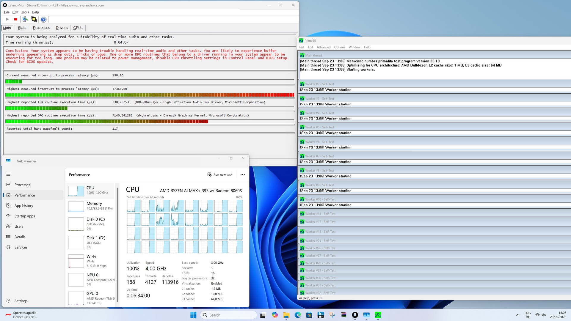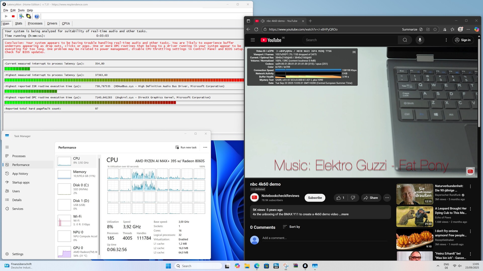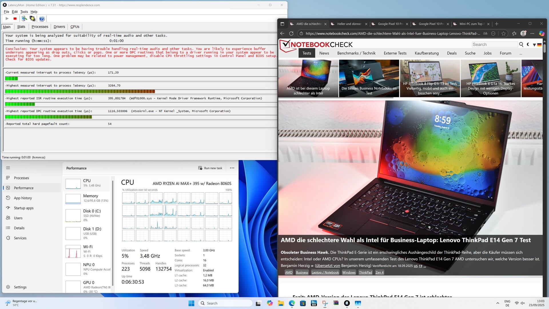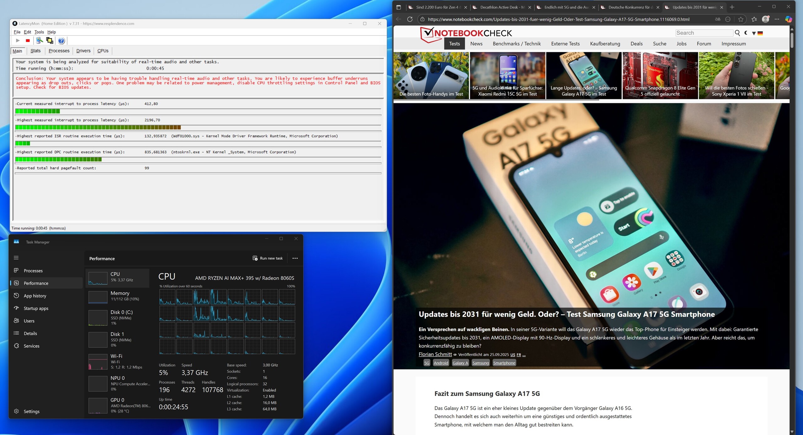 Новый BIOS (v1.03) делает Minisforum MS-S1 Max значительно тише в режиме простоя и заметно повышает общий рейтинг. Более подробную информацию можно найти в разделе "Выбросы/Шум". Хотя задержки DPC были уменьшены, они все еще не достигли высших баллов. Мы не смогли обнаружить никакого влияния на общую производительность.