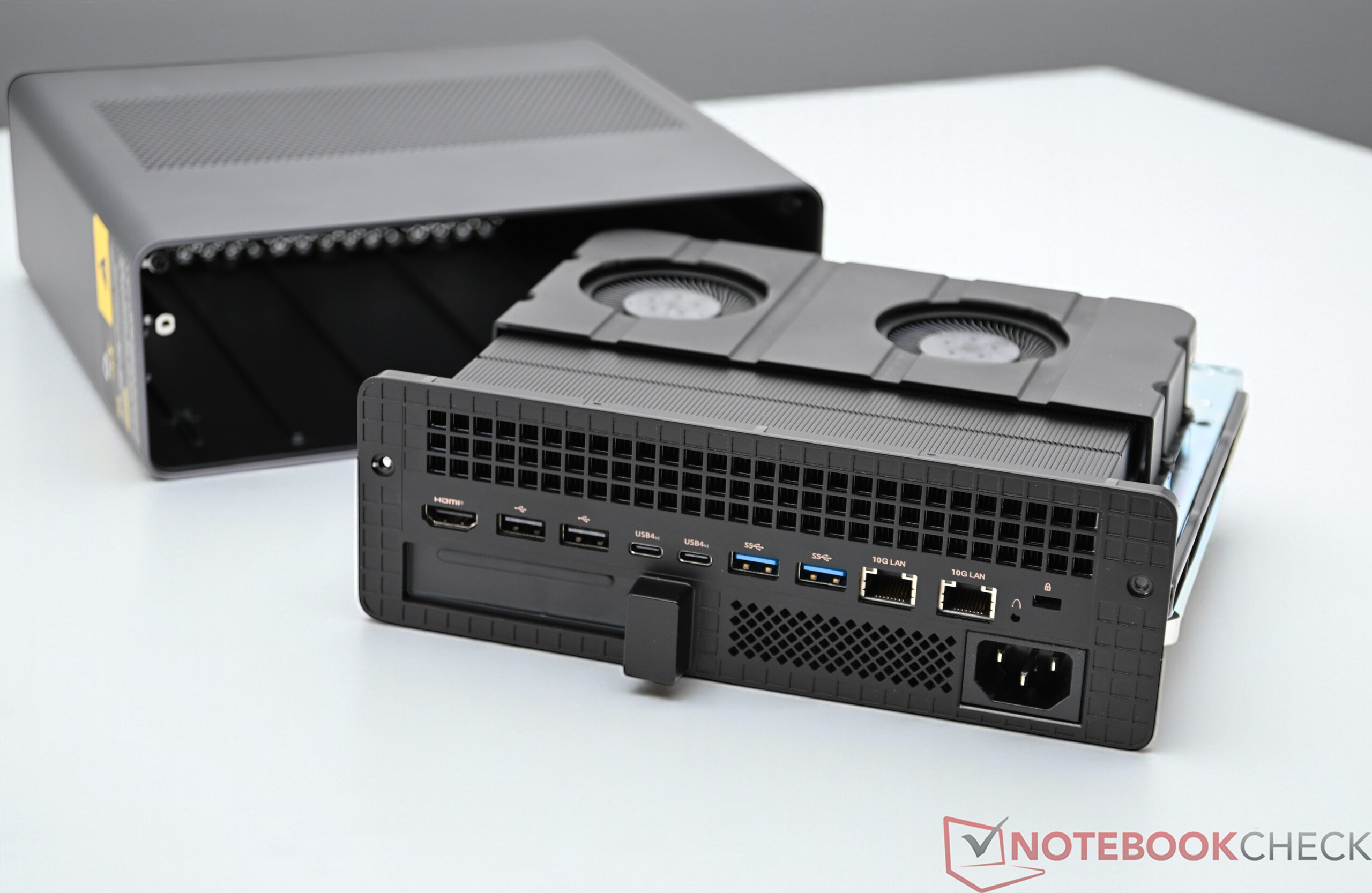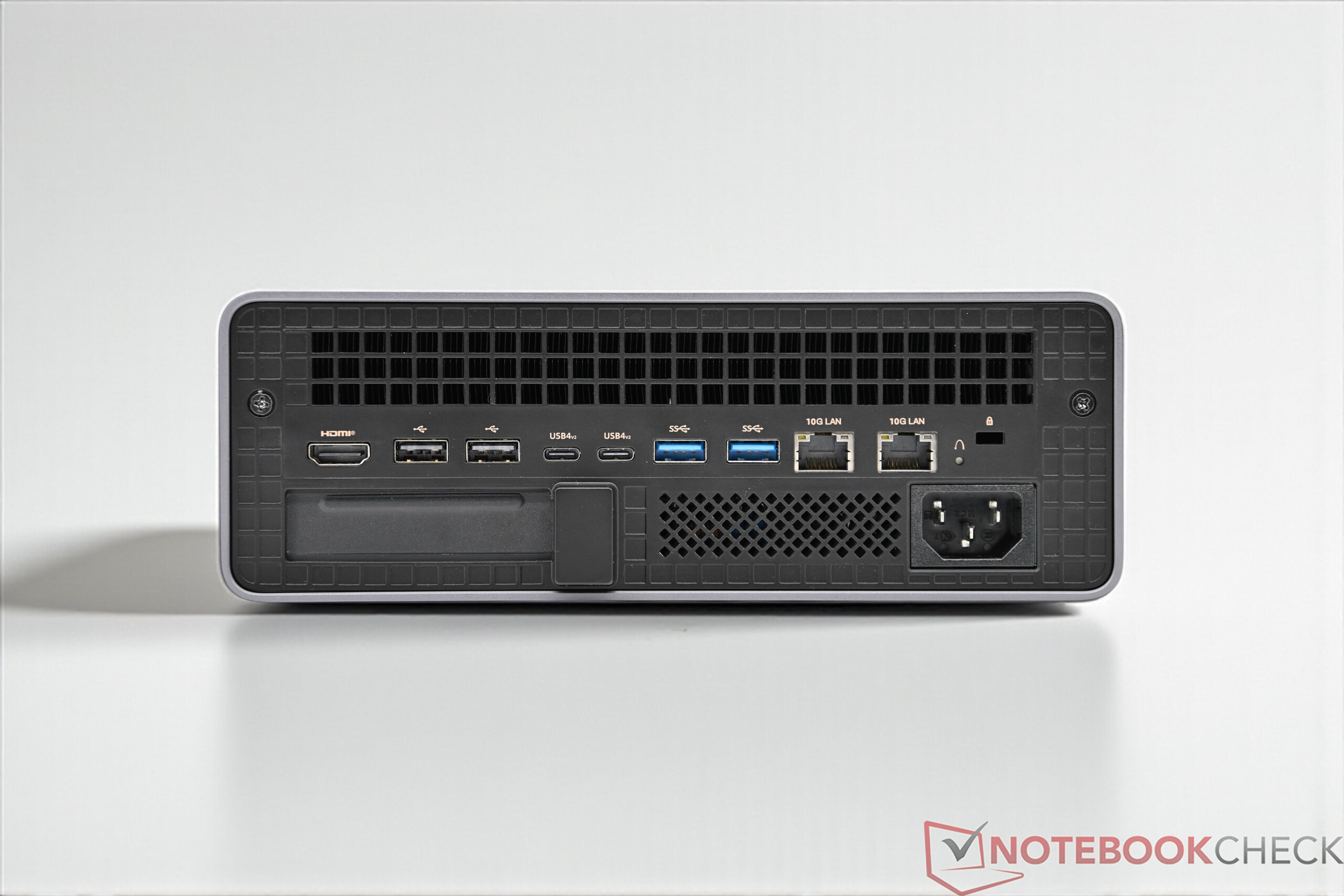 Minisforum MS-S1 Max впечатляет первоклассным корпусом, в котором удачно сочетаются металл и пластик. Что касается подключения, то MS-S1 Max может многое предложить. Широкий спектр подключений включает два порта USB4 и два сверхбыстрых интерфейса USB4 v2. Мощный комплект дополняют два порта 10G LAN, которые гарантируют максимальную производительность сети. Внутри мини-ПК также можно установить карту PCIe. Внутренний слот PCIe x16 ограничен скоростью x4.