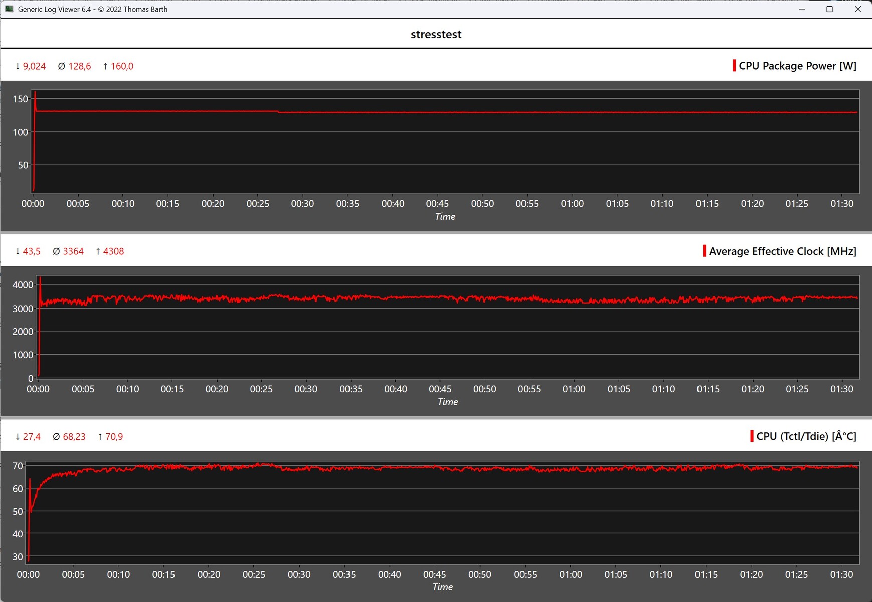 Поверхности корпуса Minisforum MS-S1 Max остаются незаметными как в режиме простоя, так и под нагрузкой. Температура процессора достигает 70 C только при полной нагрузке, и он без проблем поддерживает заявленное энергопотребление в 130 Вт в течение длительного времени. При снижении скорости вращения вентилятора на 50% охлаждение может поддерживать такую же непрерывную нагрузку, хотя температура процессора поднимается примерно до 98 C.