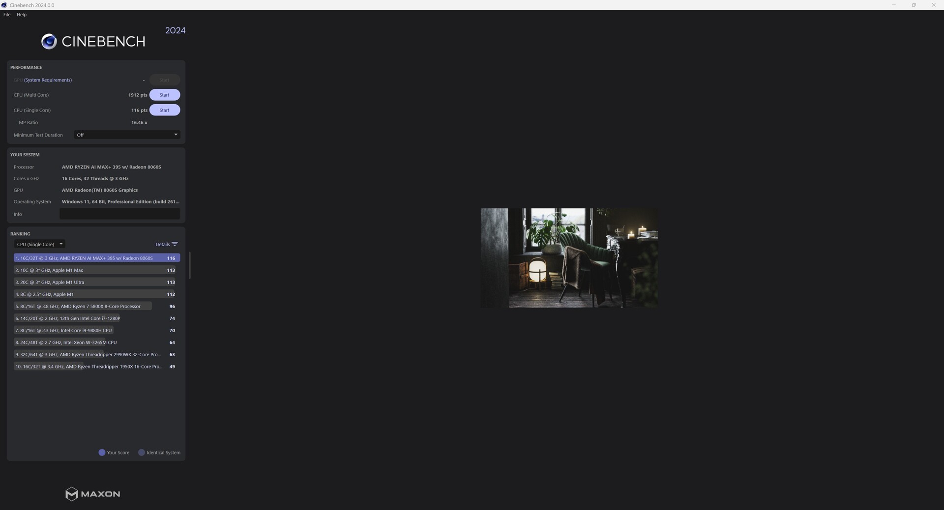 Minisforum MS-S1 Max оснащен AMD Ryzen AI Max+ 395 - на данный момент это один из самых мощных процессоров AMD в мобильном сегменте. В режиме производительности SoC может работать с мощностью до 160 Вт, в то время как непрерывное энергопотребление находится на уровне 130 Вт. Это означает, что AMD Ryzen AI Max+ 395 работает с большей производительностью, чем другие устройства с таким же процессором. По сравнению с Bosgame M5, Minisforum MS-S1 Max может превзойти его в среднем примерно на 10%. Даже Minisforum MS-A2 с AMD Ryzen 9 9955HX занимает почти второе место, несмотря на то, что Ryzen 9 обеспечивает более высокую одноядерную производительность.