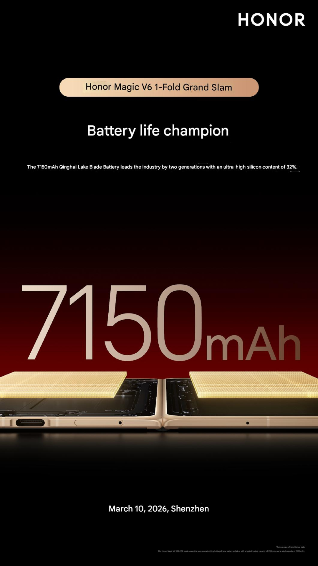 Кроме того, компания подтвердила, что китайский вариант будет поставляться с более емким аккумулятором, чем его глобальный аналог. Как показано на изображении ниже, Magic V6 будет оснащен батареей емкостью 7 150 мАч, а не 6 600 мАч, как его глобальный собрат. Судя по недавним утечкам, в Китае некоторые модели Magic V6 будут оснащаться аккумуляторами емкостью 6 850 мАч.