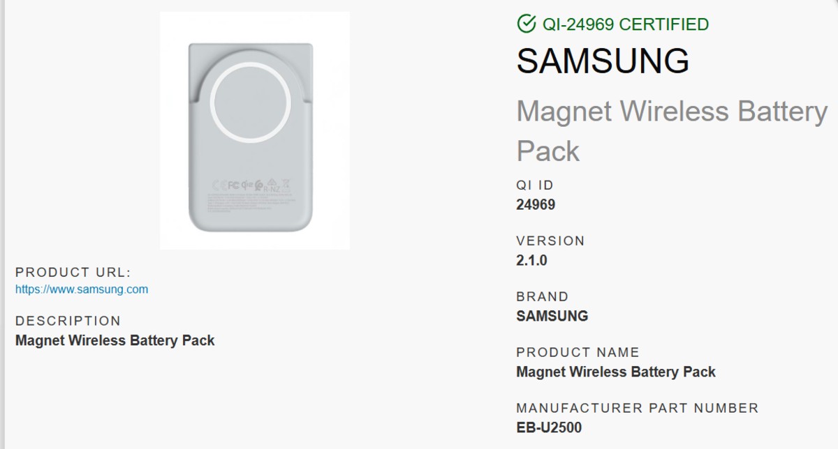 В базе данных Wireless Power Consortium появился новый магнитный беспроводной аккумулятор Samsung с модельным номером EB-U2500, который придает дополнительный вес этим слухам. Сертифицированный для поддержки беспроводной зарядки 15 Вт по стандарту Qi2, он станет первым беспроводным банком питания Samsung со встроенными магнитами. Аксессуар, который, вероятно, будет выпущен вместе с Galaxy S26, выполнен в светло-сером цвете и оснащен магнитным кольцом, которое должно позволить ему защелкиваться на совместимых смартфонах для бесшовной беспроводной зарядки.