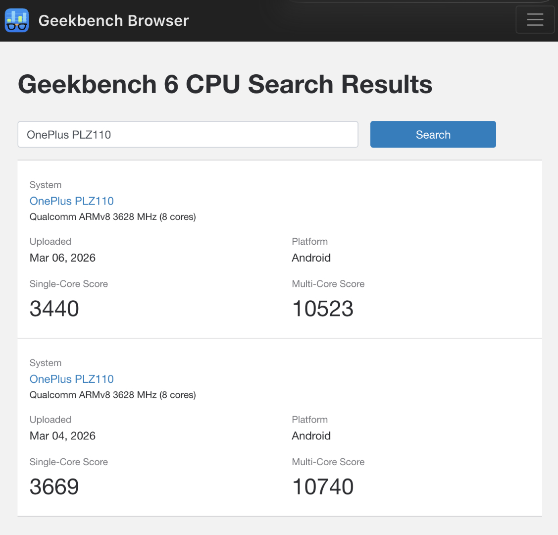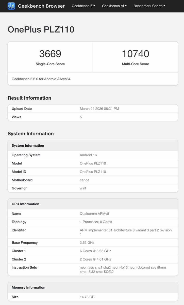 Теперь то, что, похоже, является тем же самым устройством, появилось на Geekbench в нескольких листингах. Как и ожидалось, OnePlus 15T соответствует OnePlus 15 с Snapdragon 8 Elite Gen 5 чипсетом и 16 ГБ оперативной памяти. В настоящее время OnePlus 15 является одним из самых низкорейтинговых Snapdragon 8 Elite Gen 5 устройств, которые мы тестировали до сих пор.