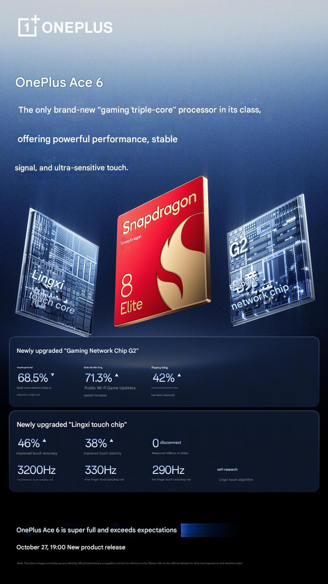 Теперь OnePlus подтвердила, что в Ace 6 используется процессор Qualcomm Snapdragon 8 Elite чипсет Qualcomm Snapdragon 8 Elite, как и OnePlus 13 до него. Более того, Ace 6 может похвастаться обновленным чипом Gaming Network Chip G2, который, как утверждает OnePlus, обеспечивает лучшую производительность сотовой связи и Wi-Fi по сравнению с предыдущими моделями. Кроме того, устройство оснащено чипом Lingxi Touch Chip, который обеспечивает максимальную отзывчивость сенсорного экрана в играх.