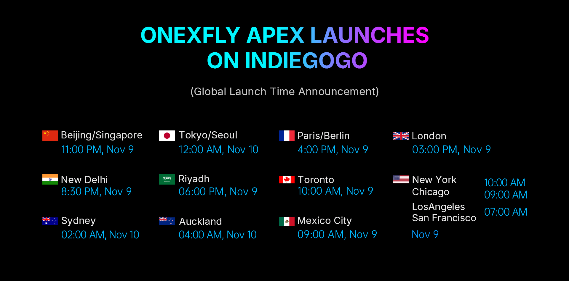 Пока мы ждем новостей о OneXPlayer Super X, One-Netbook выставляет свой игровой портативный компьютер OneXFly Apex на Indiegogo 9 ноября. В частности, компания начнет свою краудфандинговую кампанию в 15:00 UTC. Время начала кампании в других часовых поясах смотрите на изображении ниже.