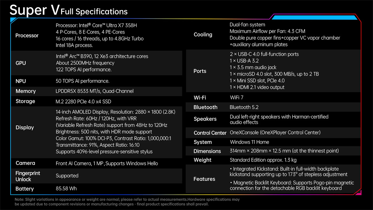 Этот игровой портативный компьютер Intel с 48 ГБ оперативной памяти LPDDR5X и твердотельным накопителем PCIe 4.0 объемом 1 ТБ в настоящее время доступен по цене $1,899 в официальном магазине. Asus, с другой стороны, предлагает ROG Flow Z13 с 32 ГБ оперативной памяти по цене $2 299,99 (сейчас $2 069,99 на Amazon). Для тех, кому интересно, полная спецификация OneXPlayer Super V прилагается ниже.