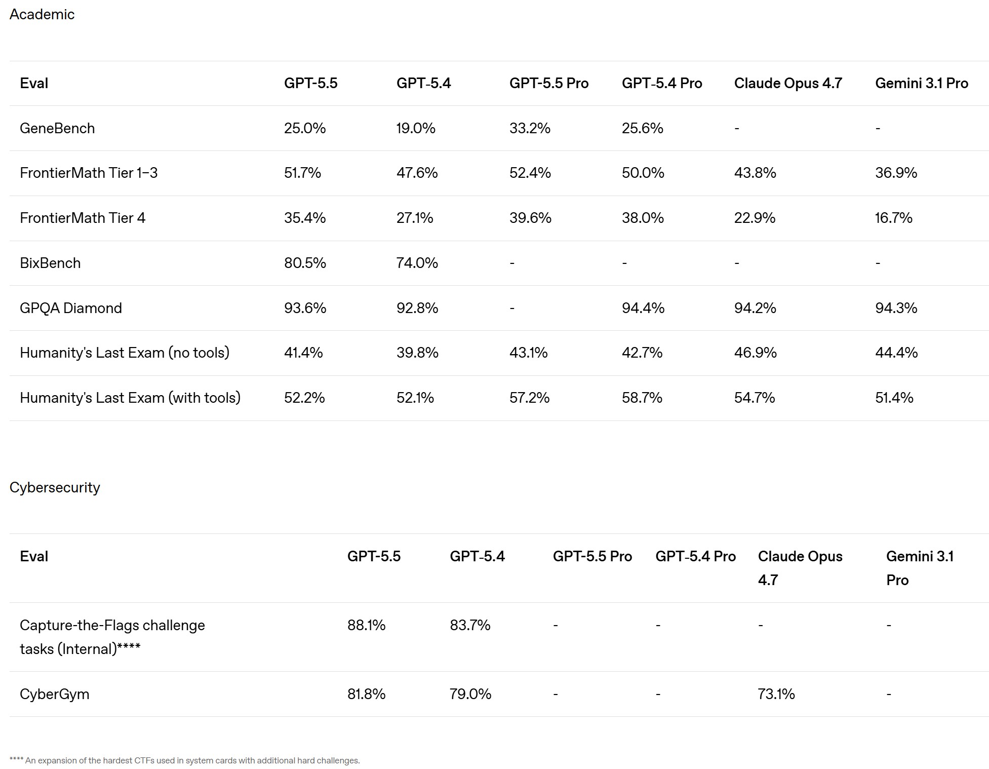 Новейшие ИИ от OpenAI продолжают совершенствоваться в своей способности решать сложные академические задачи и использовать компьютеры в качестве инструментов. Кроме того, эти усовершенствования позволяют лучше разбираться в протоколах, необходимых для создания биологических угроз, и методах, необходимых для успешного взлома сетей и систем. Часто производительность GPT 5.5 и GPT 5.5 Pro в этих областях оказывается выше, чем у конкурирующих моделей ИИ Opus 4.7 и Gemini 3.1 Pro. В последнее время пользователи моделей Claude обнаружили более небезопасный код, генерируемый ИИ Anthropic.