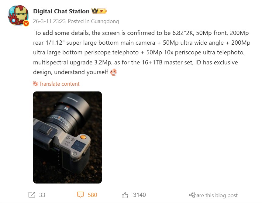 Подробности, которыми поделился Digital Chat Station о Oppo Find X9 Ultra, кажутся более правдоподобными по сравнению с этим. Многие из спецификаций упомянутые в недавнем сообщении Weibo на сайте https://www.weibo.com/6048569942/QvIQ3ALF3?pagetype=profilefeed уже распространялись ранее, включая основную камеру 200 МП 1/1,12 дюйма, в которой, скорее всего, используется тот же сенсор Sony LYT-901, что и в модели Vivo X300 Ultra. Помимо второго 200-Мп перископического телеобъектива (3x), 50-Мп перископического телеобъектива (10x) и 50-Мп ультраширокой камеры, Find X9 Ultra, как сообщается, будет оснащен мультиспектральным сенсором, как и его предшественник (улучшенным до 3,2 МП, по словам автора утечки), 6,82-дюймовым 2K-дисплеем и 50-Мп фронтальной камерой. Одной из примечательных новых деталей является предположение о том, что Oppo может выпустить Master Edition, который, по слухам, будет иметь 16 Гб оперативной памяти, 1 Тб для хранения данных и эксклюзивный дизайн. Окончательный дизайн остается неизвестным, хотя Oppo может черпать вдохновение в камере Hasselblad X2D, как показано в сообщении на Weibo от автора утечки
