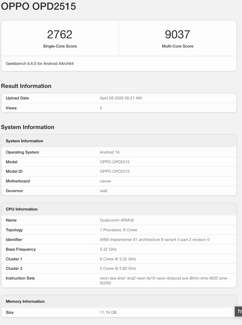 Новое устройство Oppo с модельным номером 'OPD2515', предположительно Oppo Pad Mini, появилось на сайте Geekbench. Для тех, кто не в курсе, Oppo Pad Mini - это предстоящий компактный Android планшет компании Oppo планшетожидаемый к запуску 21 апреля в Китае.