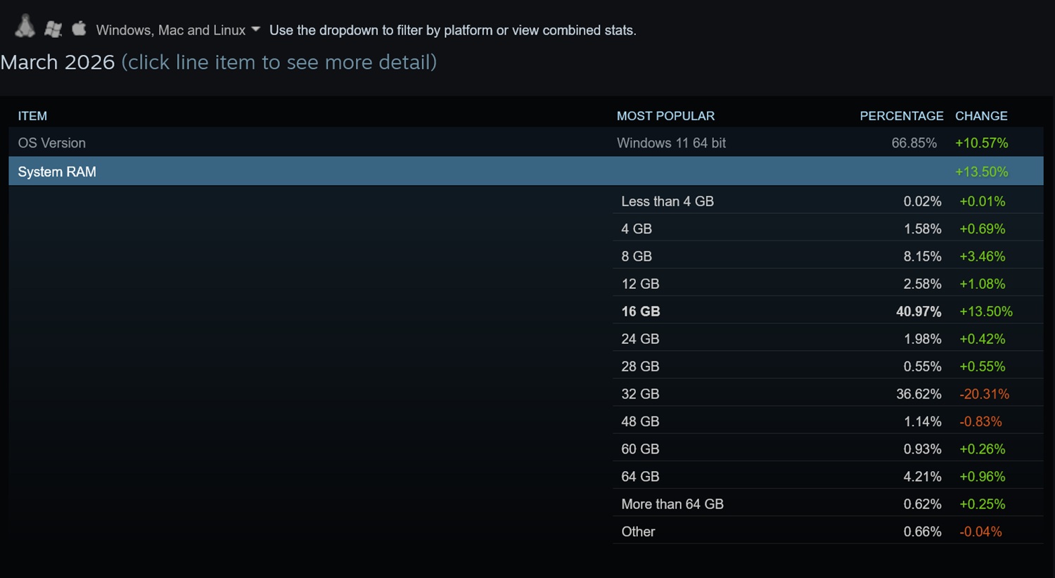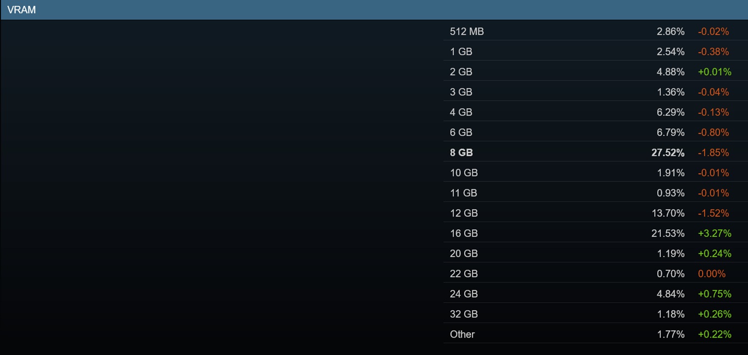 Вариант, включающий 16 Гб планок оперативной памяти DDR4 и DDR5, занял первое место в опросе Steam, набрав 40,97%. Альтернатива с 32 ГБ теперь занимает 36,62%, поскольку геймеры борются с завышенными ценами на память.
