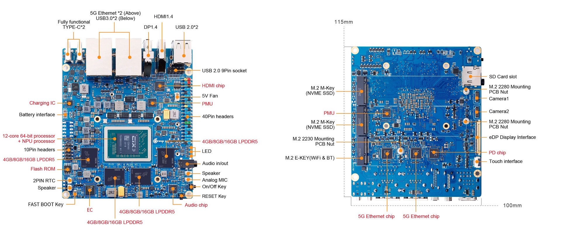 Orange Pi 6 Plus это новый одноплатный компьютер, который рекламируется с особенно высокой производительностью для приложений искусственного интеллекта. Поэтому он оснащен NPU с производительностью до 45 TOPS. Это ставит Orange Pi 6 Plus на один уровень с современными чипсетами AMD и Intel, по крайней мере, с точки зрения производительности NPU. Например AMD Ryzen AI 9 HX 370 имеет производительность искусственного интеллекта 40 TOPS. Такая высокая производительность ИИ может быть полезна для запуска различных моделей ИИ локально на SBC. Например, возможным вариантом использования может стать проверка прямой трансляции с камеры на наличие признаков пожара в удаленном месте.
