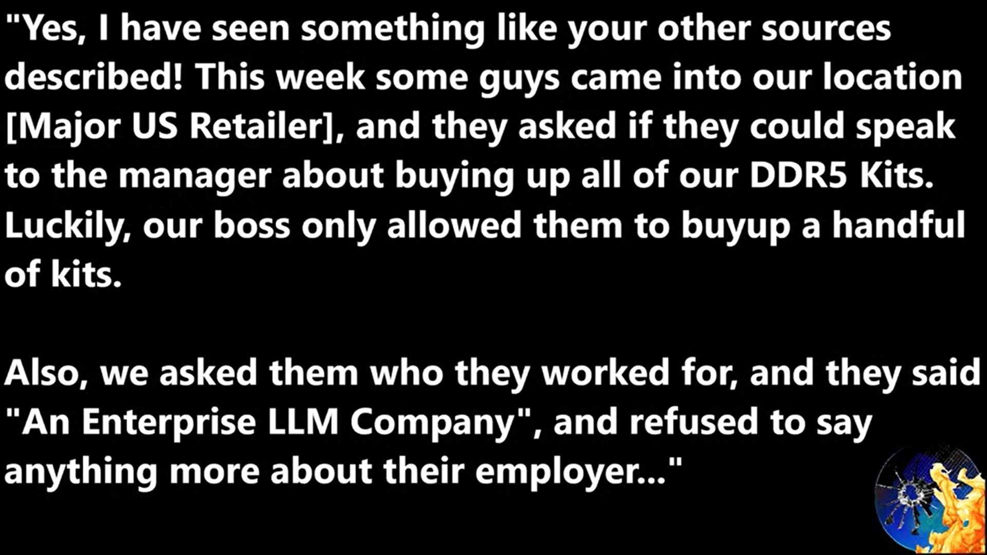 Согласно сайту Moore's Law Is Dead (Закон Мура мертв)компания OpenAI не только владеет большей частью мировых запасов памяти, но и якобы скупает потребительские комплекты DDR5. По сообщениям, сотрудники OpenAI заходят в розничные магазины и пытаются заполучить как можно больше комплектов DDR5. Информация поступила в MLID из нескольких источников, включая розничные магазины и поставщиков оперативной памяти.