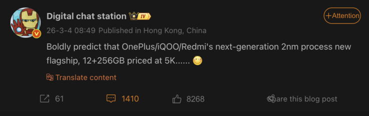 Тем не менее, Digital Chat Station считает, что цены на новые флагманы OnePlus, iQOO и даже Redmi будут начинаться примерно с CNY 5,000 (~$725). Таким образом, модель redmi K100 Pro Max, о котором ходят слухи может стоить на 25% дороже, чем текущая модель Redmi K90 Pro Maxкоторый доступен во всем мире как Poco F8 Ultra.