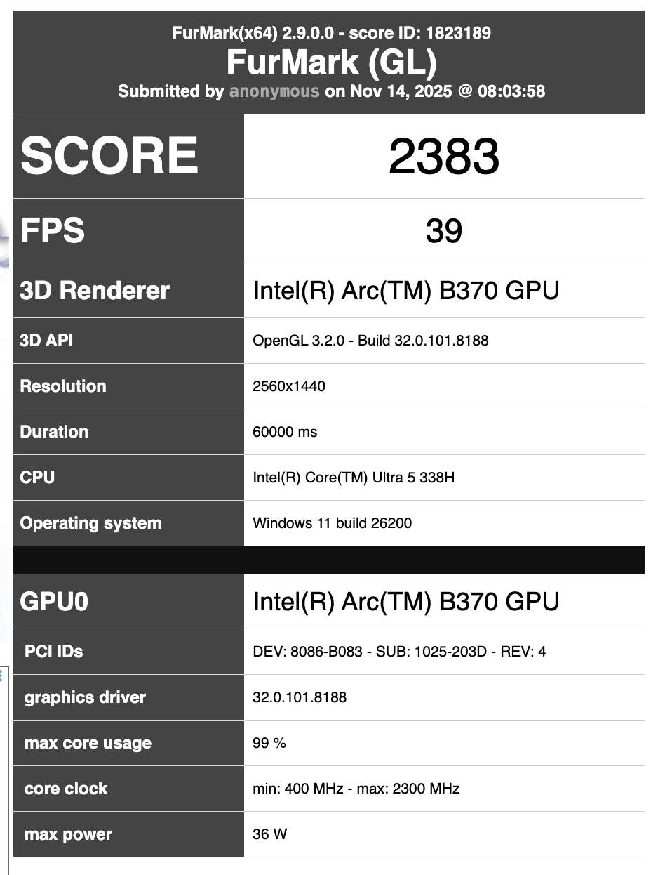 С одной стороны, FurMark подтверждает, что в портативных компьютерах Panther Lake используется Arc B370, 10-ядерный iGPU, который работает на частоте от 400 МГц до 2 300 МГц, как следует из приведенной ниже информации. С другой стороны, бенчмарк также сообщает, что устройство имеет TDP 36 Вт. Кстати, это всего на 1 Вт меньше, чем у MSI Claw 8 AI Plus. На данном этапе еще предстоит выяснить, насколько ядра Panther Lake Xe3 улучшат игровую производительность по сравнению с уже существующими вариантами AMD Hawk Point, AMD Strix Point и Intel Lunar Lake.