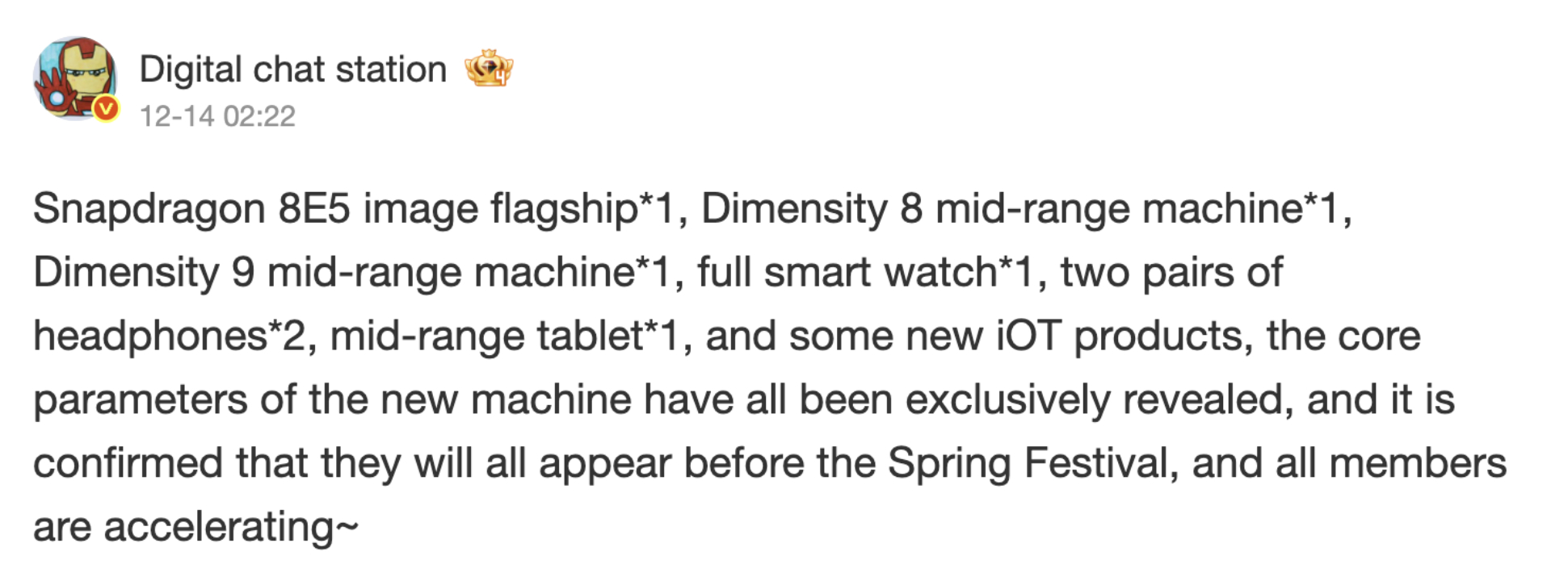 Тем временем Digital Chat Station предположила, что Xiaomi 17 Ultra дебютирует вместе со смартфонами среднего класса серий Dimensity 8 и Dimensity 9. Как показано на скриншоте выше, по слухам, будут представлены смарт-часы, две пары наушников и планшет среднего класса, а также свежие IoT-продукты.