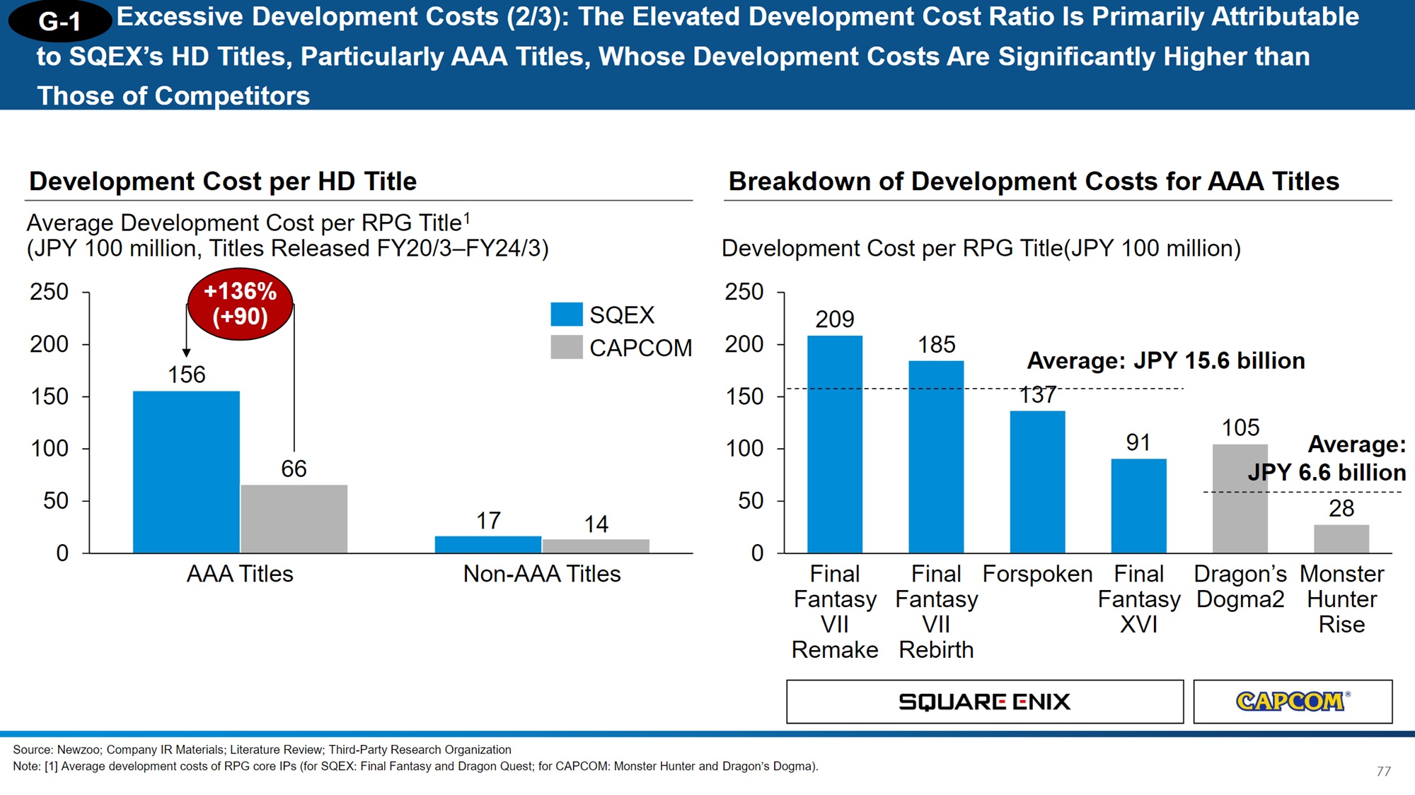 компания 3D Investment Partners опубликовали на сайте серию слайдов в которых подробно описываются предполагаемые расточительные расходы компании. Вместе с другими акционерами фирма хочет "вести конструктивный диалог с SQEX HD, чтобы повысить ее корпоративную стоимость" Согласно отчету, производство многих игр Square Enix было слишком дорогим по сравнению с доходами, которые они приносили.