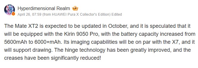 Согласно утечке, Mate XT2 будет работать на чипе Kirin 9050 Pro. Кроме того, хотя подробности о дисплее пока ограничены, источник утверждает, что Huawei внесла значительные улучшения в технологию шарнира. Это не только повысит прочность механизма складывания, но и уменьшит видимые складки, которые являются одной из самых больших проблем при использовании складных телефонов. A предыдущая утечка также предполагала, что в устройстве может использоваться усовершенствованное ультрагибкое стекло.
