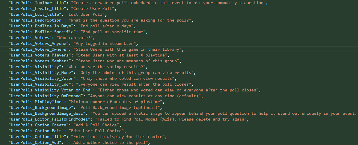 Текстовые метки описывают полный рабочий процесс опроса: авторы могут установить время окончания опроса "через x дней" или в конкретный момент времени и определить, кто имеет право голосовать, включая "любой залогиненный пользователь Steam", "пользователи Steam, в библиотеке которых есть эта игра", "пользователи Steam, имеющие не менее X игрового времени" или "члены этой группы". Имеются переключатели видимости результатов, например, "только администраторы этой группы могут просматривать результаты", "только те, кто проголосовал, могут просматривать результаты" или "все могут просматривать результаты после закрытия опроса", а также опция "по требованию", которая подразумевает, что страницы результатов могут быть открыты в любое время разрешенными зрителями. Другие ярлыки содержат требование минимального времени воспроизведения, фоновое изображение для опроса и стандартные способы создания вариантов, такие как "Добавить вариант опроса" и "Редактировать вариант опроса пользователя", что, скорее всего, относится к шаблону редактора, а не к специальным форумным хакам.