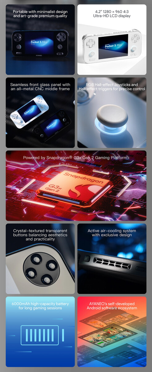 Pocket S Mini - это новейшая разработка компании Ayaneo Snapdragon G3x Gen 2-после модели Pocket Ace, Pocket DS, Pocket DMG, Pocket Evo и Pocket S до него (цена $479,99 на Amazon). В общем, Pocket S Mini - самый маленький из всех: 167 x 78 x 18,5 мм и 305 г. Тем не менее, новый карманный компьютер оснащен аккумулятором емкостью 6 000 мАч, системой активного охлаждения и элементами управления с эффектом Холла.