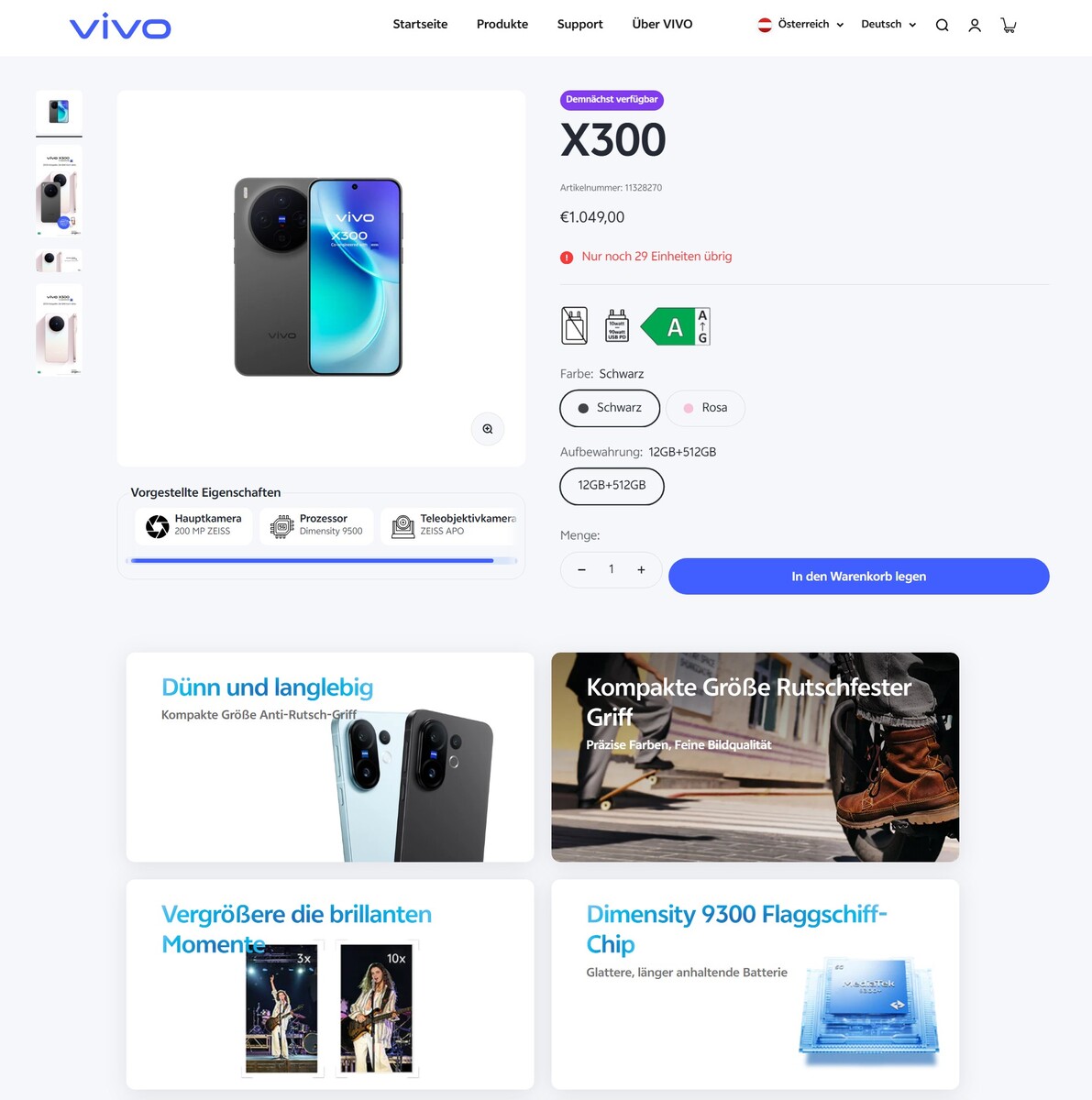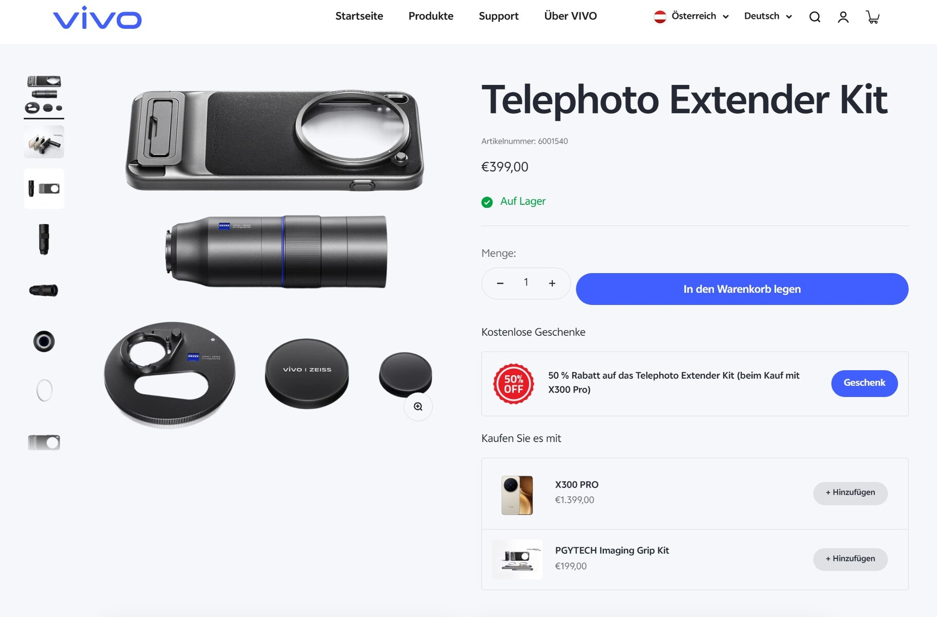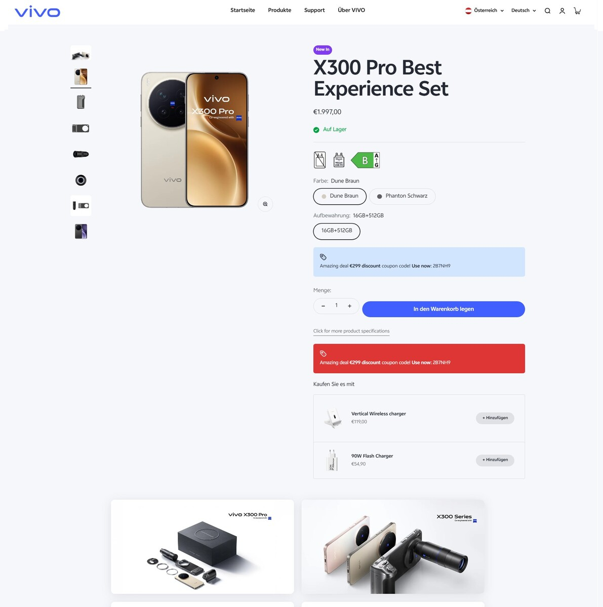 Как мы уже рассказывали ранее на этой неделе, Oppo установила цену на Find X9 и Find X9 Pro по цене €999 и €1 299 в Еврозоне. По какой-то причине компания Vivo применила надбавку в €50 к своим сопоставимым смартфонам, несмотря на то, что выпустила их на рынок позже, чем Oppo. В результате серия X300 будет стоить в Еврозоне 1 049 евро, не включая такие аксессуары, как комплект телеобъектива, который будет продаваться по цене 399 евро, что на 50 евро дешевле, чем аналог от Oppo. Однако на старте продаж Vivo предложит различные коды скидок, которые должны снизить цены. Более подробную информацию Вы найдете на изображениях ниже.