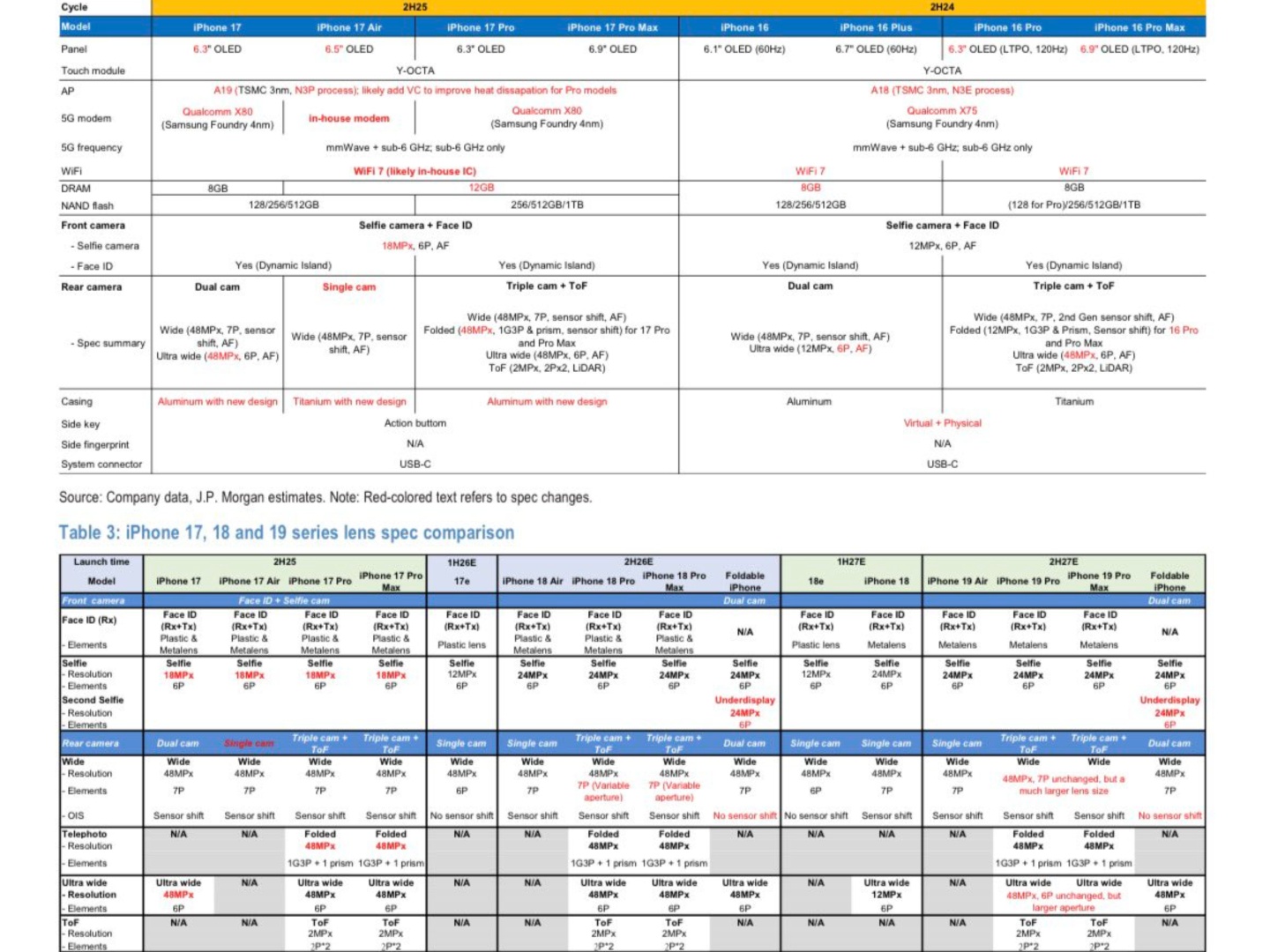 Отраслевой аналитик Макс Вайнбах опубликовал сравнение характеристик предстоящих моделей iPhone, проведенное JP Morgan, и в нем перечислены iPhone Air 2 и iPhone Air 3. Вайнбах отмечает, что JP Morgan и другие подобные банки "очень хорошо" умеют получать подобную информацию из цепочки поставок. Это говорит о том, что цепочка поставок Apple готовится к выпуску iPhone Air 2 и Air 3, или как они в итоге будут называться, несмотря на низкие продажи iPhone Air.