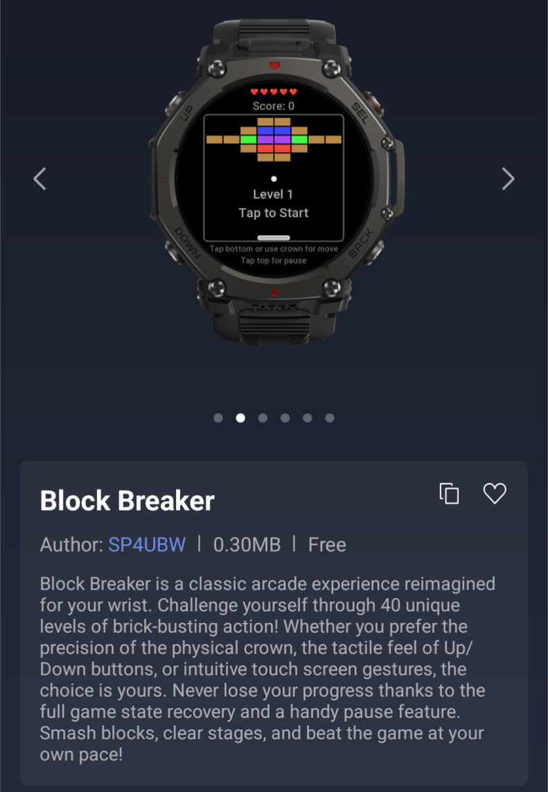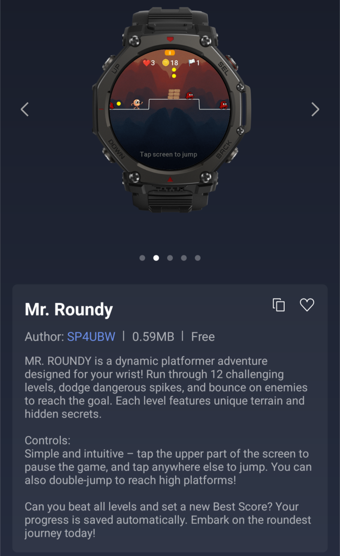 Кроме того, для пользователей смарт-часов Amazfit есть две новые игры Mini App. Первая - Block Breaker, классическая аркадная игра с 40 уровнями и возможностью управления с помощью заводной головки или кнопок. Вторая - Mr. Roundy, приключенческая игра-платформер с 12 уровнями, где пользователь может заставить персонажа прыгать, касаясь экрана. Последние два мини-приложения - Rain Runner и Squash Scoring.