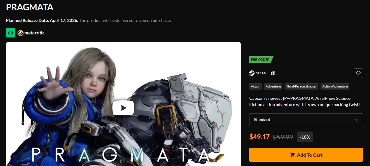 Обычно новые релизы не получают скидок так рано. В большинстве случаев игрокам приходится ждать несколько недель или даже месяцев, прежде чем они увидят снижение цен. Однако в данном случае дело обстоит иначе. На Fanatical игра Pragmata уже доступна с 18% скидкой, в результате чего ее цена снизилась с $59,99 до $49,17.