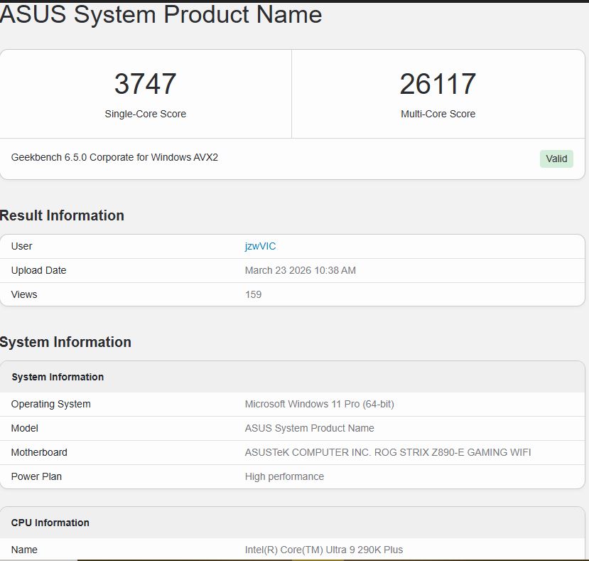 Замеченный HXL on X, 24-ядерный Core Ultra 9 290K Plus заработал в одноядерном и многоядерном Geekbench 6.5 3,747 и 26,117 баллов соответственно. Как и в случае с другими процессорами Arrow Lake Refresh, core Ultra 9 290K Plus работал на тактовой частоте +100 МГц (5,8 ГГц) по сравнению с Core Ultra 9 285K и использовал новую бинарную оптимизацию Intel (IBOT).